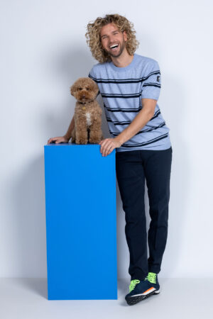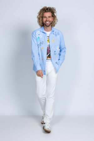 Chino met een knoop- en ritssluiting en lusjes in de band voor een ceintuur. Hij heeft steekzakken aan de voorkant, paspelzakken aan de achterkant en stretch in de stof waardoor hij heerlijk zit