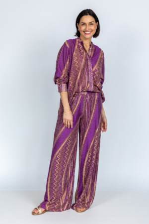 Wijde broek met een elastische band in de taille, steekzakken aan de voorkant en een all-over gevlekte print