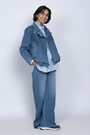 Soepel vallende jeans met wijde pijpen, een knoop- en ritssluiting en lusjes in de band voor een ceintuur. Hij heeft steekzakken aan de voorkant, opgestikte zakken aan de achterkant en een rafelrandje aan de onderkant