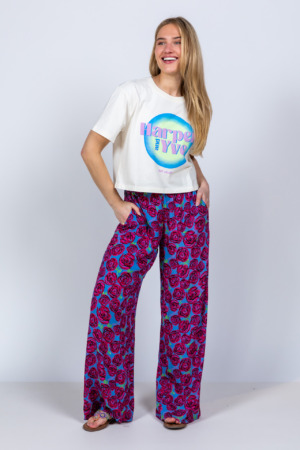 Jeans met een knoop- en ritssluiting, wijde pijpen en de letter M in de achterzak verwerkt
