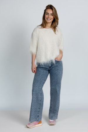 7/8 jeans met een knoop- en ritssluiting, grote zakken aan de voorkant en opgestikte zakken aan de achterkant. Ook zit er stretch in de stof waardoor hij comfortabel zit
