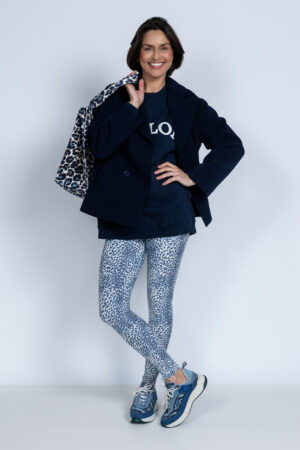 Blauw/ecru gestreepte katoenen sweater met een boothals, de merknaam aan de voorkant en splitjes aan de zijkant