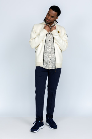 Broek met een knoop- en ritssluiting, lusjes en een koordje in de band. Hij heeft steekzakken aan de voorkant, paspelzakken aan de achterkant en een klein beetje stretch in de stof waardoor hij comfortabel draagt