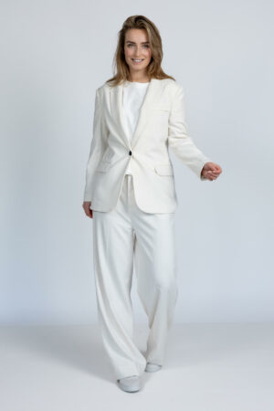 Soepel vallende jeans met wijde pijpen en een elastische band met strikkoordje in de taille. Hij heeft steekzakken aan de voorkant en een opgestikte zak aan de achterkant