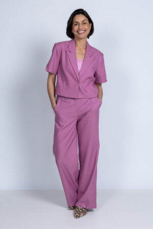 Wijde katoenen broek met een knoop- en ritssluiting, bandplooi en lusjes in de band voor een ceintuur. Hij heeft steekzakken aan de voorkant, fake zakken aan de achterkant en een all-over bloemenprint in knalgroen