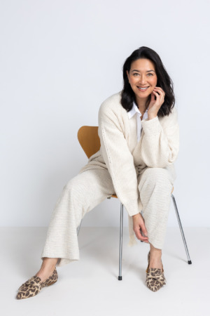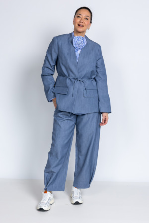 Kimono jasje met een strikceintuur in de taille, opgestikte zakken en een unieke print in ecru/jeans