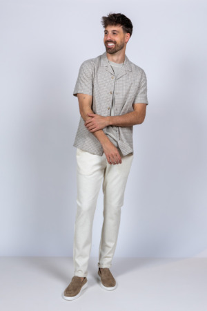 Krijtstreep broek met een knoop- en ritssluiting en lusjes in de band voor een ceintuur. Hij heeft steekzakken aan de voorkant, paspelzakken aan de achterkant en stretch in de stof waardoor hij comfortabel draagt