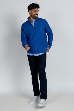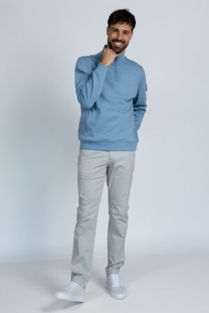 Chino jeans met een knoop- en ritssluiting en lusjes in de band voor een ceintuur. Hij heeft steekzakken aan de voorkant en fake zakken aan de achterkant. Ook zit er stretch in de stof waardoor hij comfortabel draagt