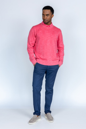 Broek met een knoop- en ritssluiting en lusjes in de band voor een ceintuur. Hij heeft steekzakken aan de voorkant, paspelzakken aan de achterkant en een klein beetje stretch in de stof waardoor hij comfortabel zit. Ook heeft hij een heel fijn visgraatmotief in de stof