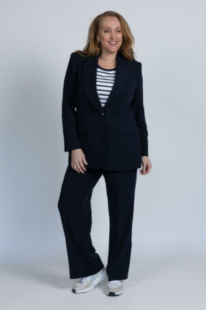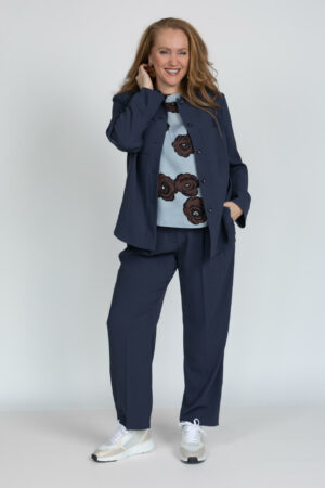 Broek met een knoop- en ritssluiting en lusjes in de band voor een ceintuur. Hij heeft steekzakken aan de voorkant, opgestikte zakken aan de achterkant en een all-over dierenprint