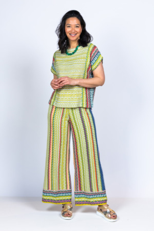 Broek met wijde pijpen, een elastische band in de taille en een crochet motief