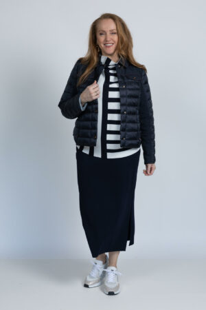 Kort jasje met een kraag, knopen, steekzakken en hij heeft een structuurtje in de stof