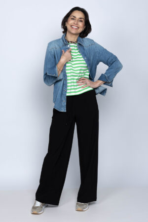 Leren broek met een elastische band met koordje, steekzakken aan de voorkant, fake zakken aan de achterkant en hij heeft splitjes aan de onderkant