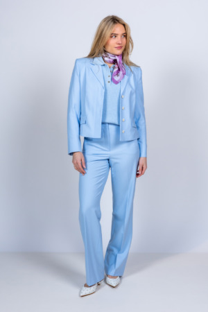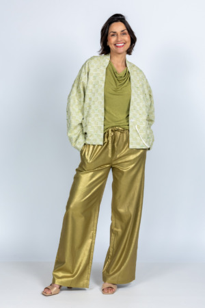 Zijde pantalon met een rits aan de zijkant en elastiek in de band aan de achterkant. Hij heeft steekzakken aan de voorkant, een fake zak aan de achterkant en een uniek dessin