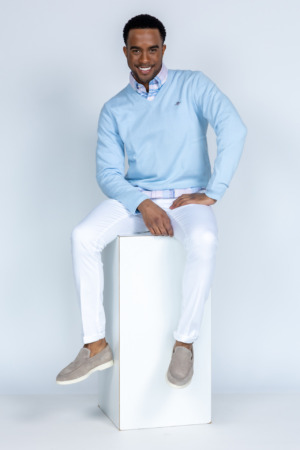 Chino met een knoop- en ritssluiting en lusjes in de band voor een ceintuur. Hij heeft steekzakken aan de voorkant, paspelzakken aan de achterkant en stretch in de stof waardoor hij heerlijk zit