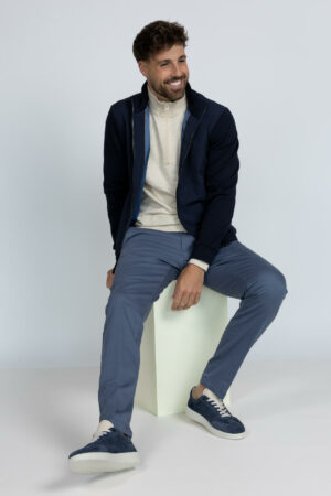 Chino met een knoop- en ritssluiting en lusjes in de band voor een ceintuur. Hij heeft steekzakken aan de voorkant, fake zakken aan de achterkant en stretch in de stof waardoor hij lekker draagt