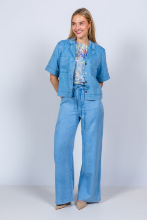 Zachte jeans met wijde pijpen, een knoop- en ritssluiting en strikkoordje in de band. Hij heeft steekzakken aan de voorkant, opgestikte zakken aan de achterkant en all-over pailletten in de vorm bloemen