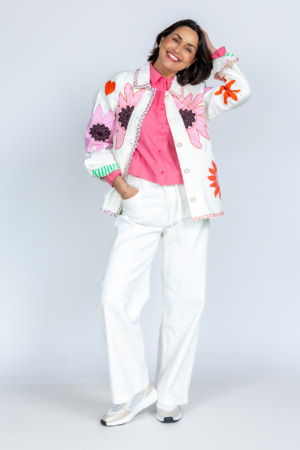 Blouse met een ronde hals met ruches, opgestike bloemen aan de voorkant en op de manchetten. Ook heeft hij elastiek en ruches aan de manchetten
