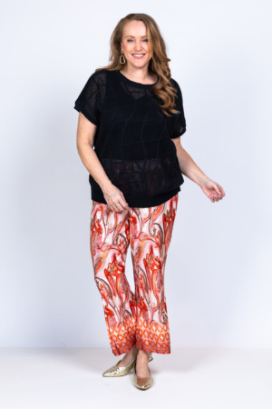 Mouwloze top met een all-over print in oranje tinten. Hij heeft een ronde hals en koordje aan de zijkant