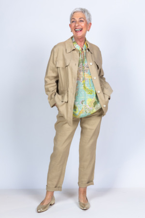 7/8 broek met een elastische band met tekst en een koordje in de taille. Hij heeft steekzakken aan de voorkant en stretch in de stof waardoor hij comfortabel draagt