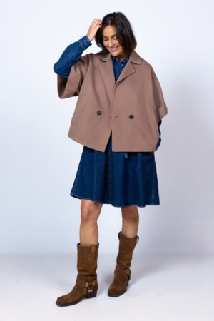 Jeansjurk tot de knie met lange mouwen en een strikceintuur in de taille. Hij heeft 2 klepzakken op de borst, steekzakken aan de zijkant en knoopjes van boven naar beneden