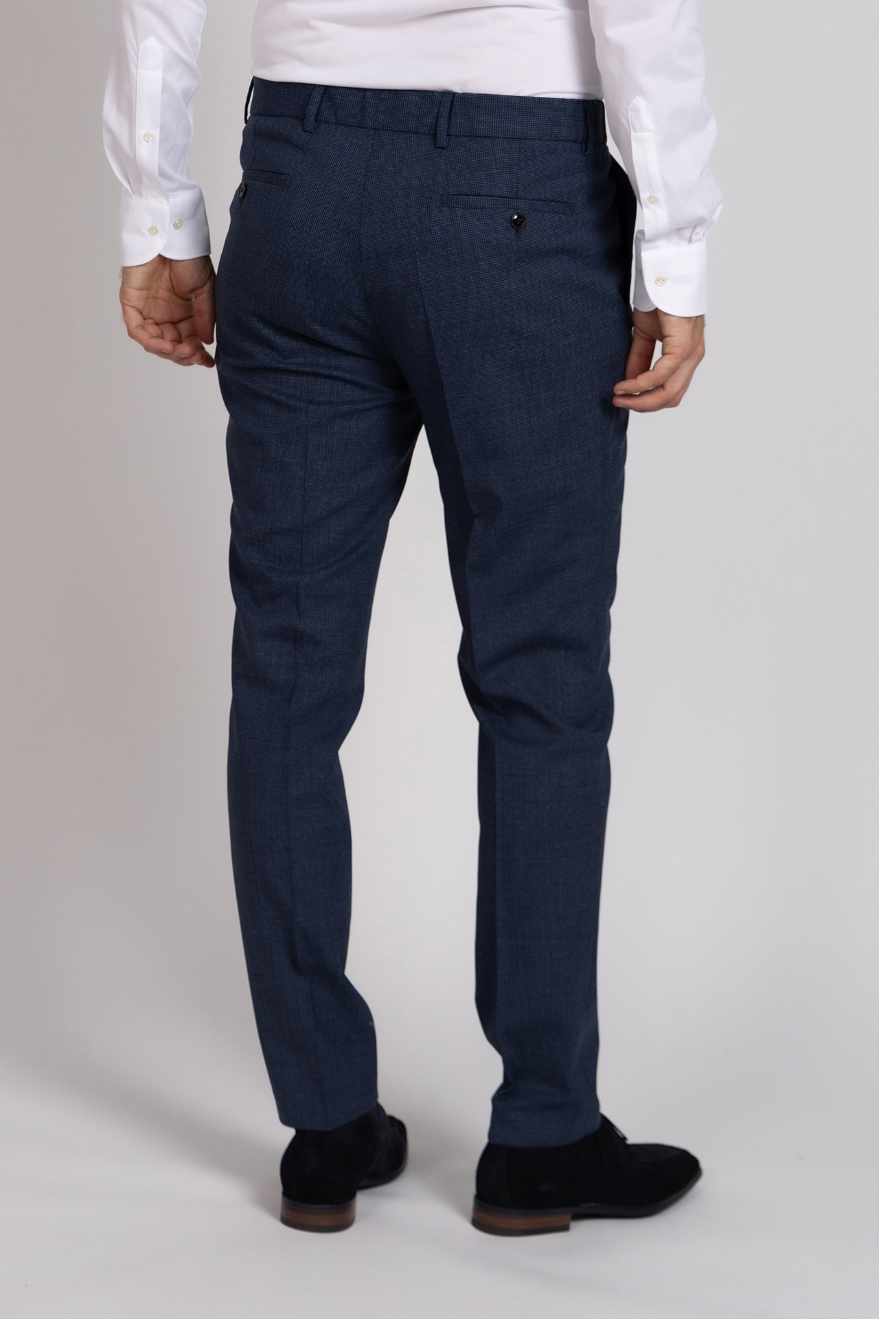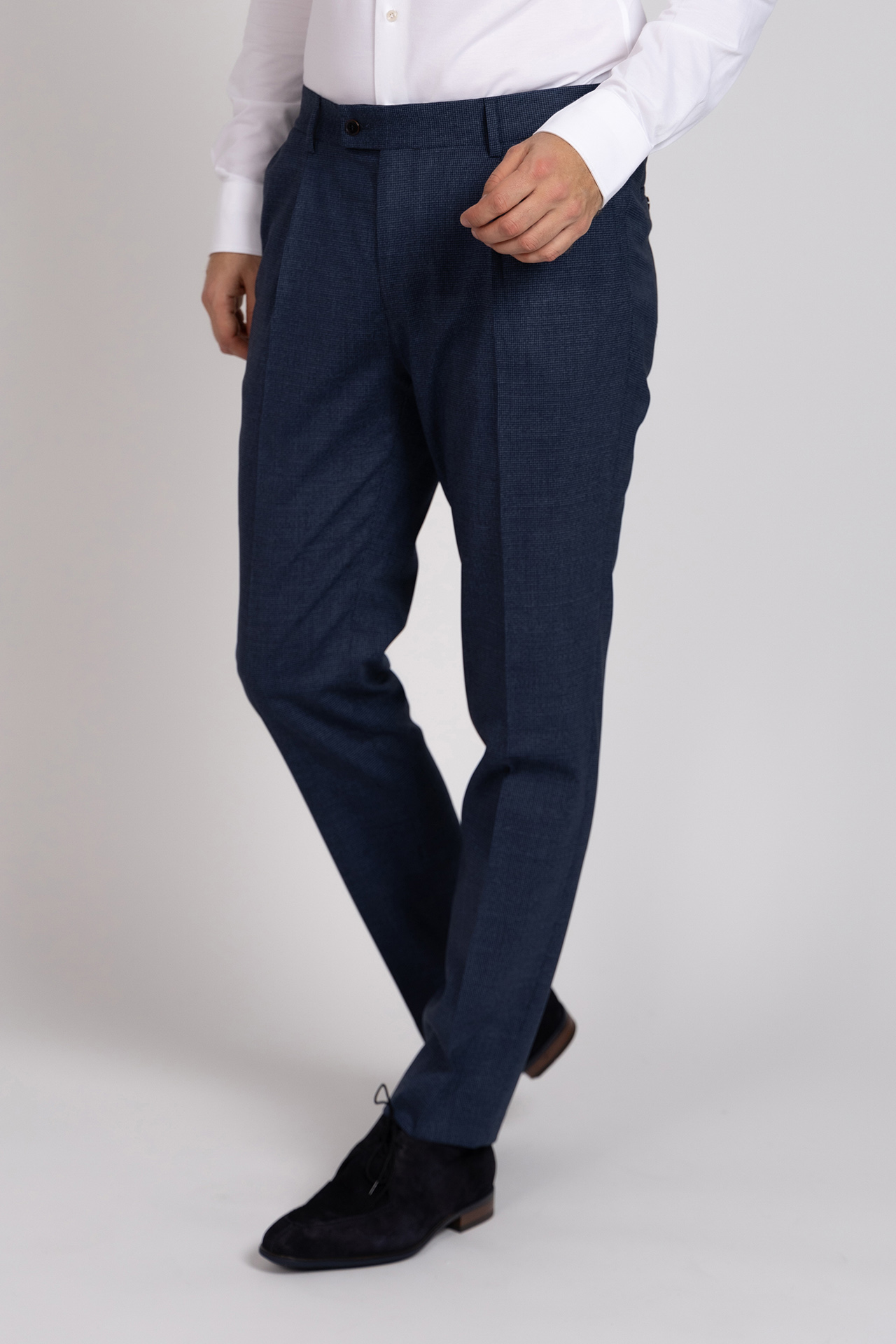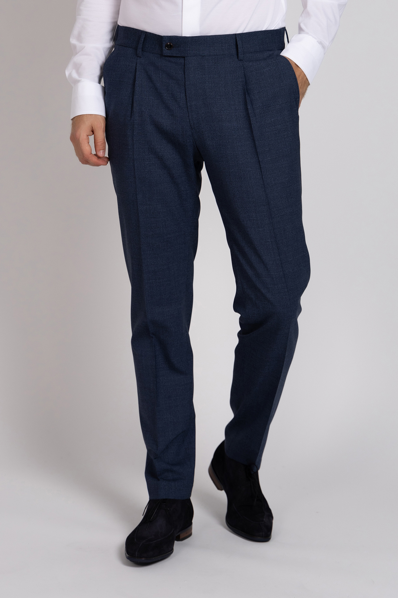 Pantalon met een slanke pasvorm, bandplooi, een knoop- en ritssluiting en lusjes in de band voor een ceintuur. Hij heeft een fijn ruitdessin, steekzakken aan de voorkant en paspelzakken aan de achterkant