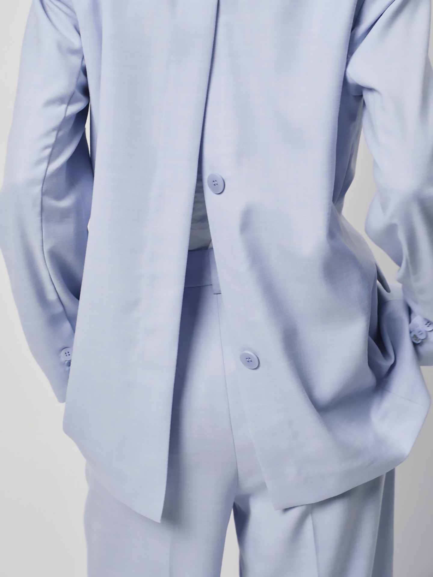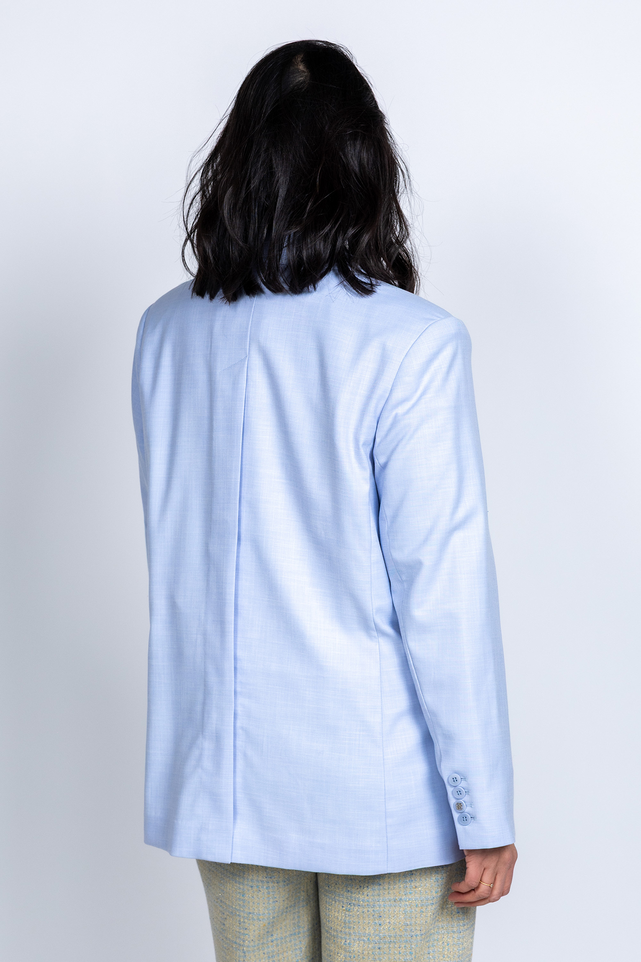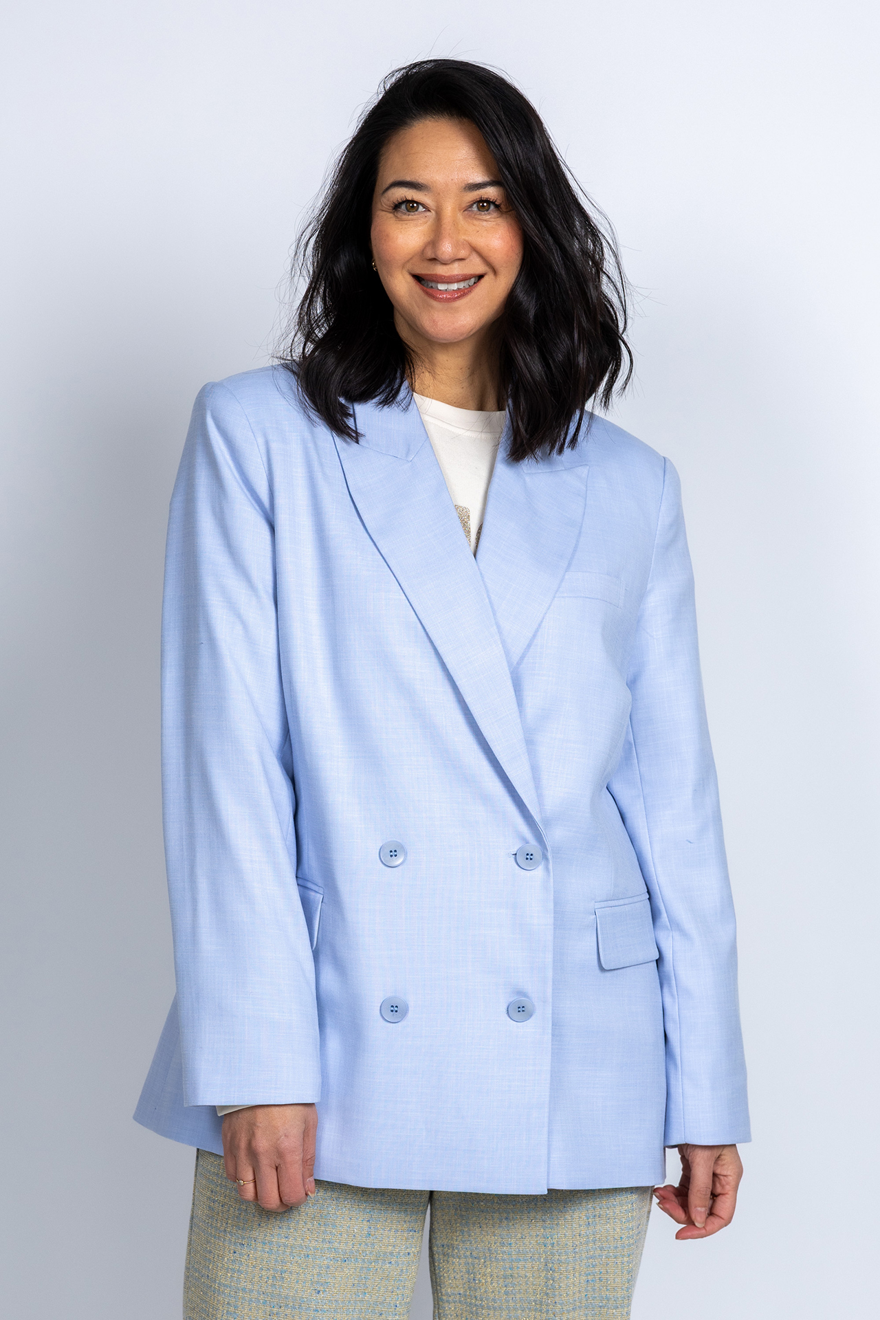 Loose fit double breasted blazer met een reverskraag en fake klepzakken aan de voorkant. Hij heeft een split met knopen aan de achterkant die zowel open als dicht gedragen kan worden
