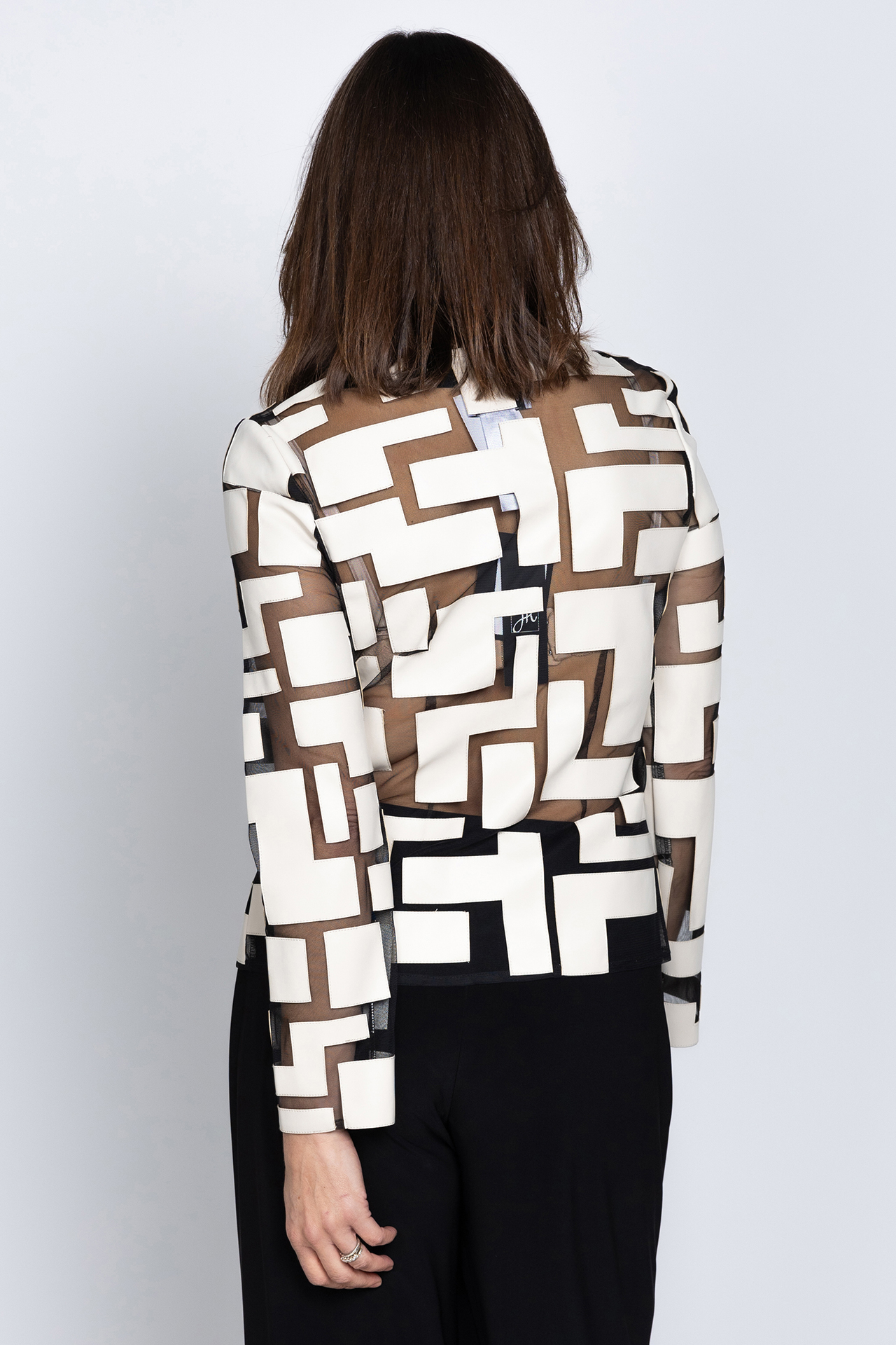 Ecru jasje met een binnenkant van zwart gaas, ritssluiting en hij heeft een ronde hals