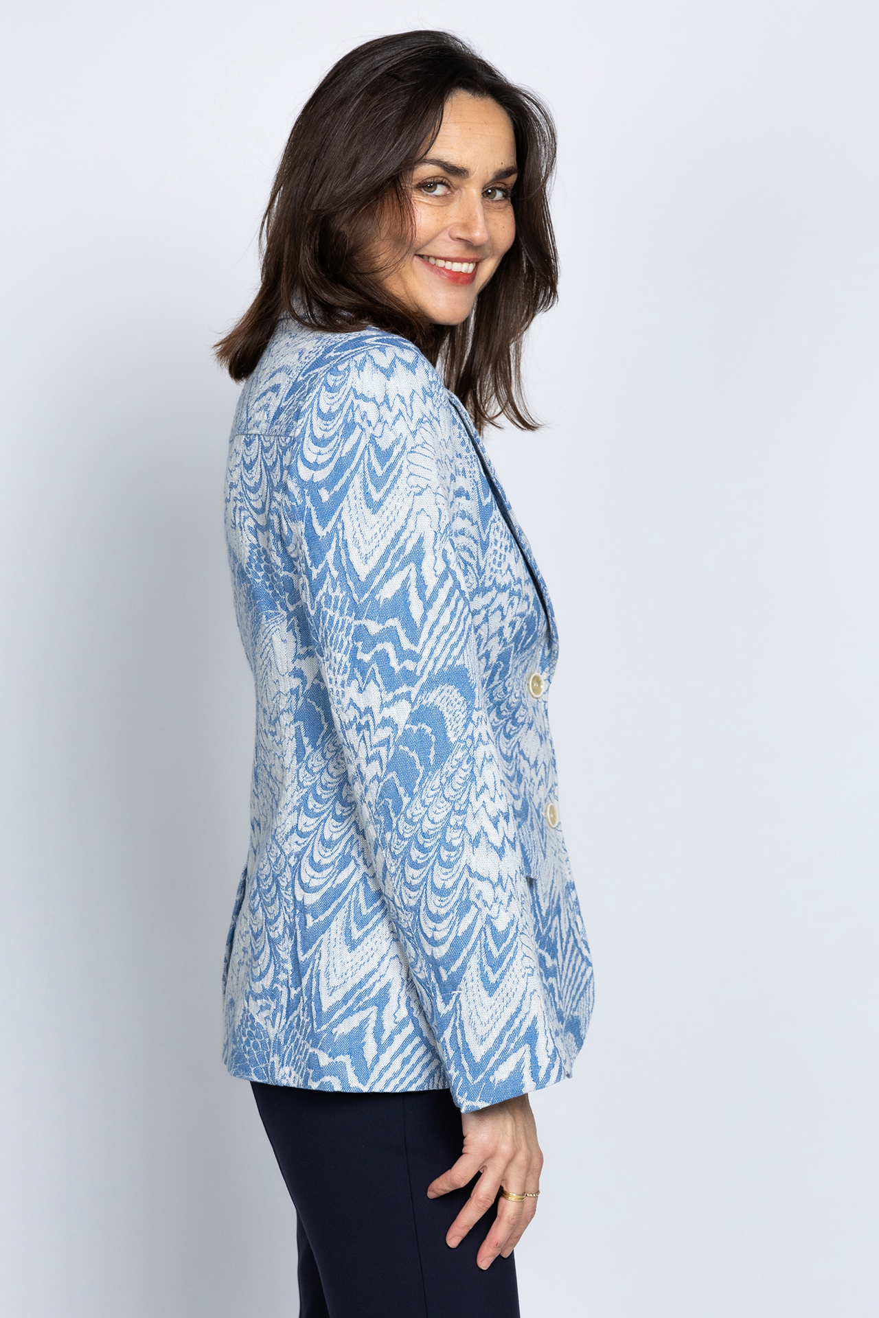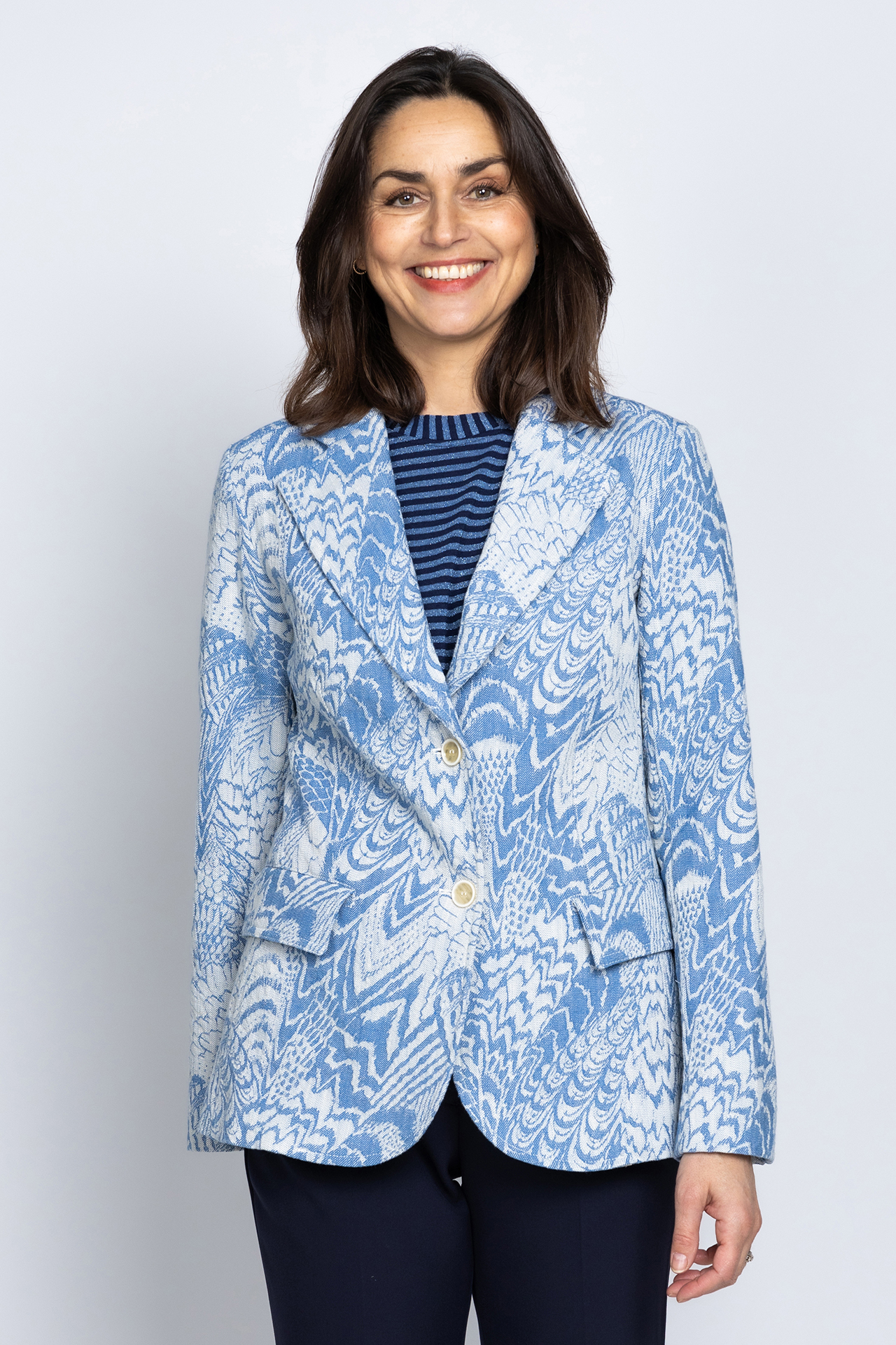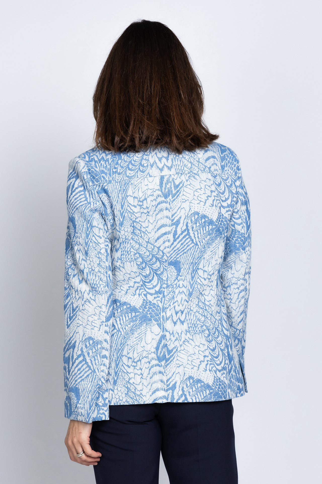 Getailleerde blazer met een reverskraag, knopen en klepzakken aan de voorkant. Hij heeft een all-over print in lichtblauw/ecru