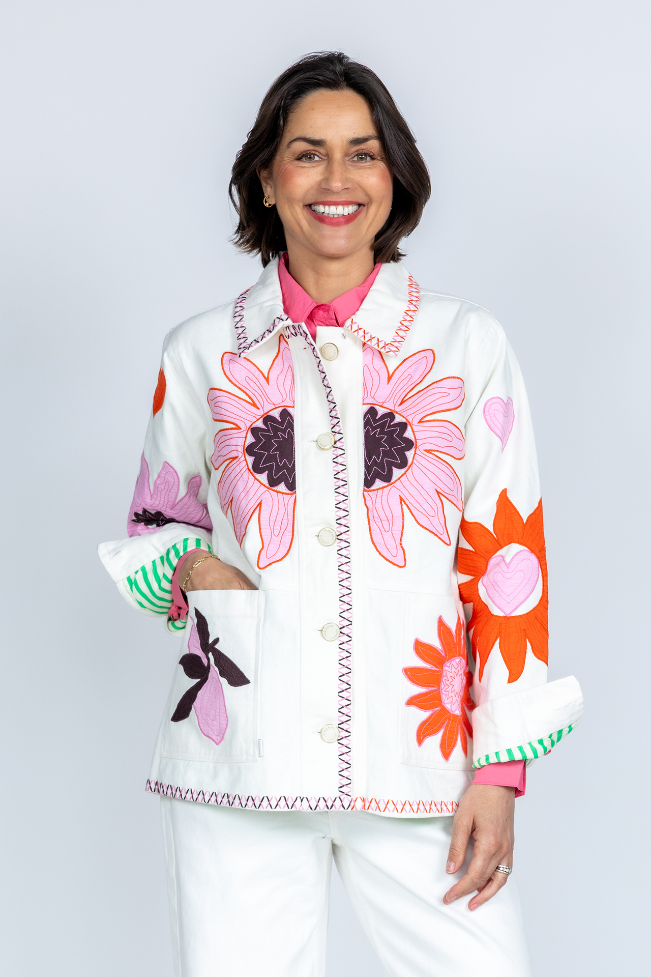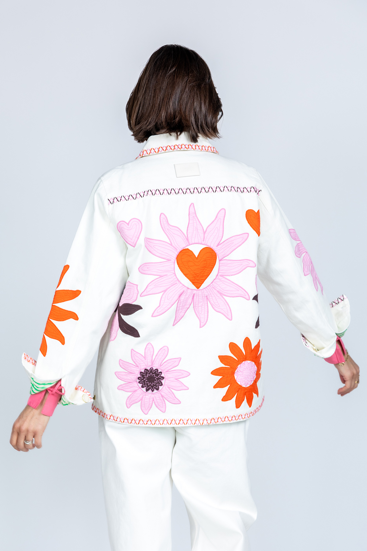 Katoenen jasje met knopen, geborduurde bloemen en hartjes en hij heeft een leuke gestreepte binnenkant
