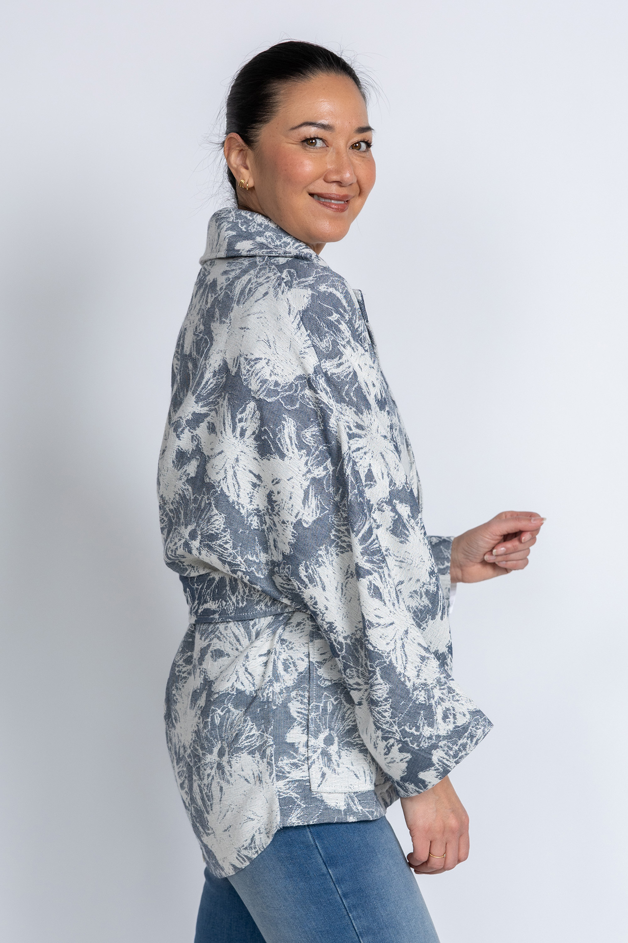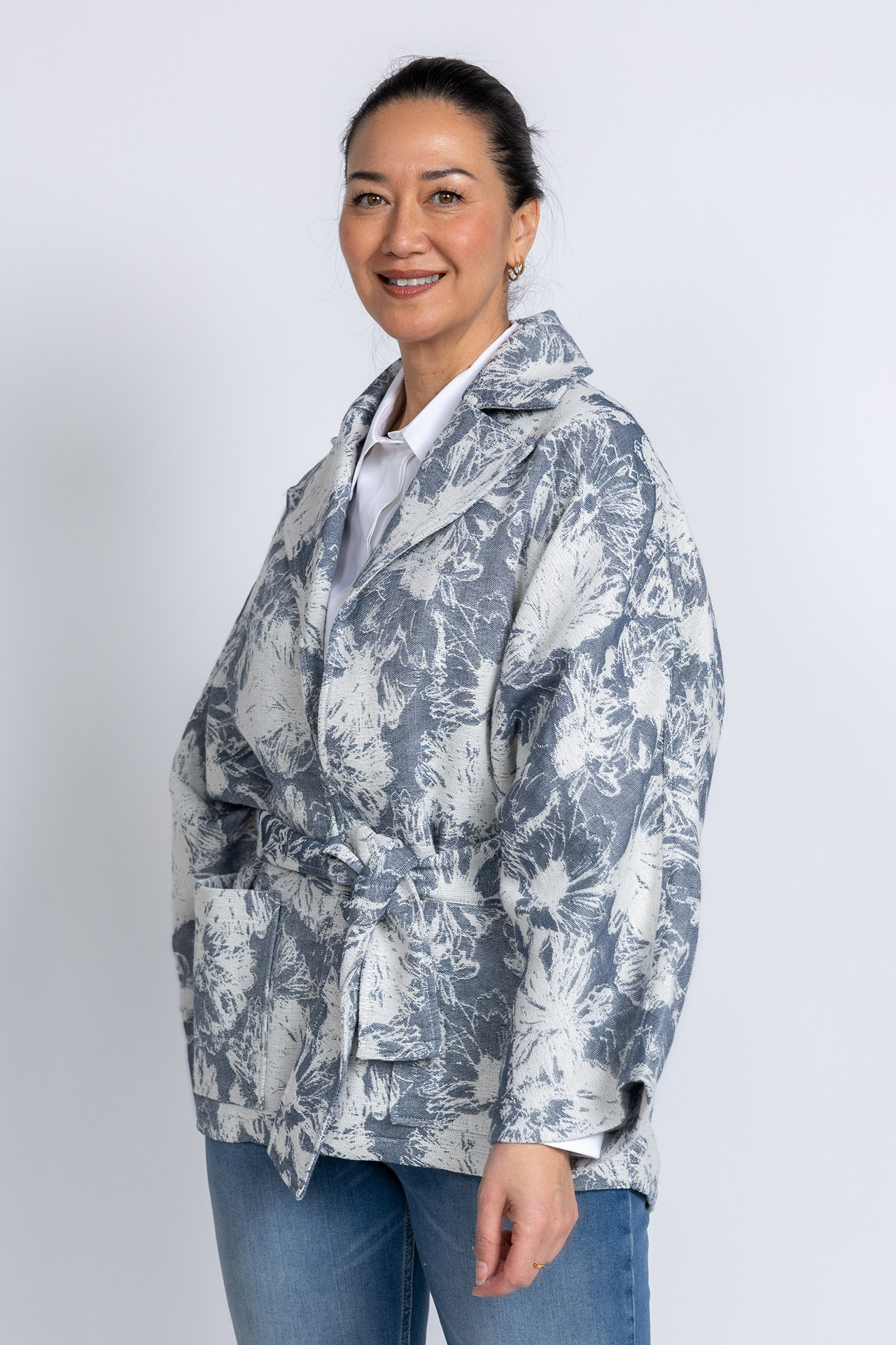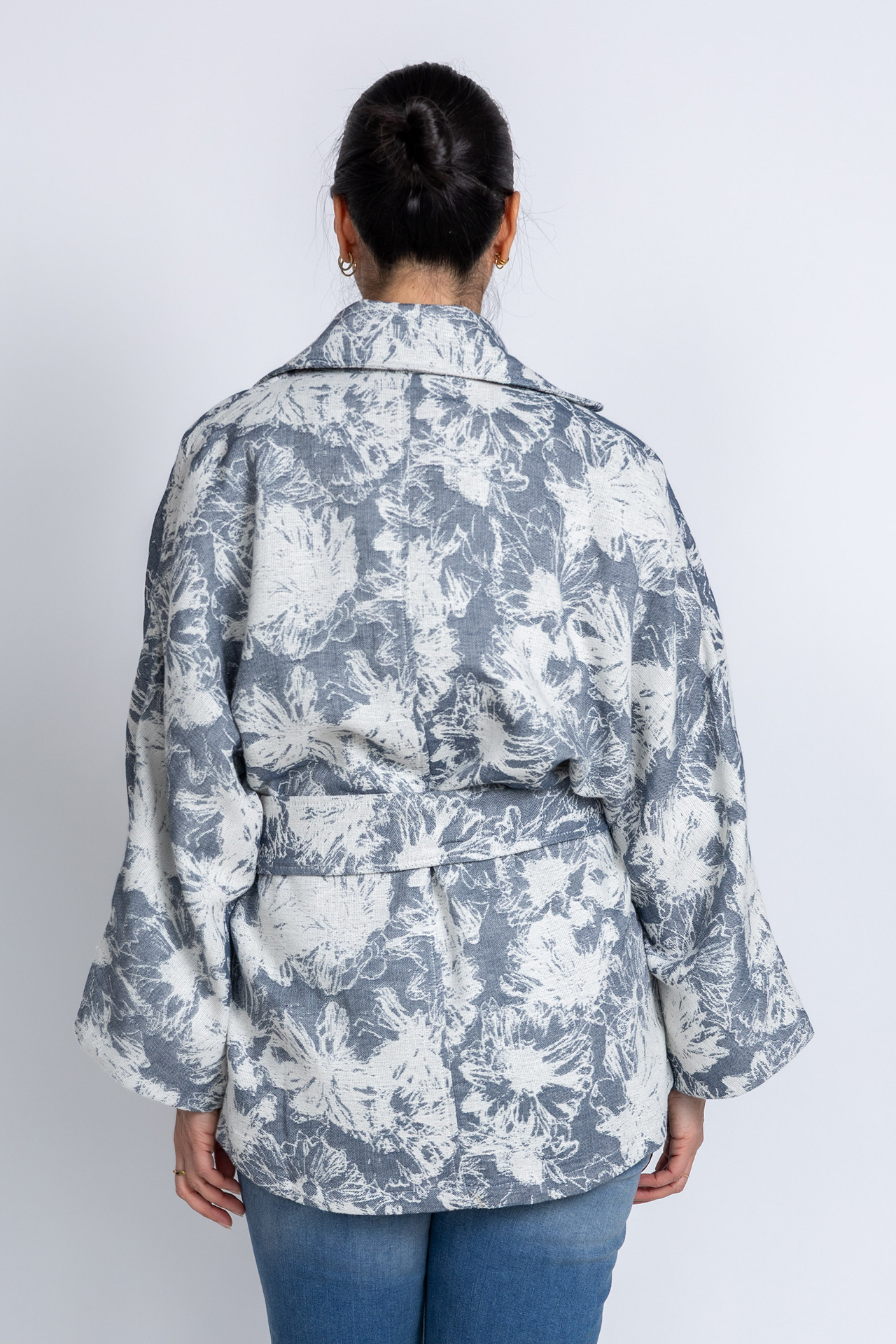 Kimono jasje met een strikceintuur in de taille, opgestikte zakken en een unieke print in ecru/jeans