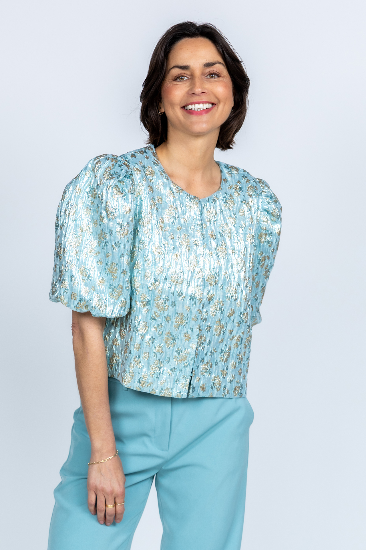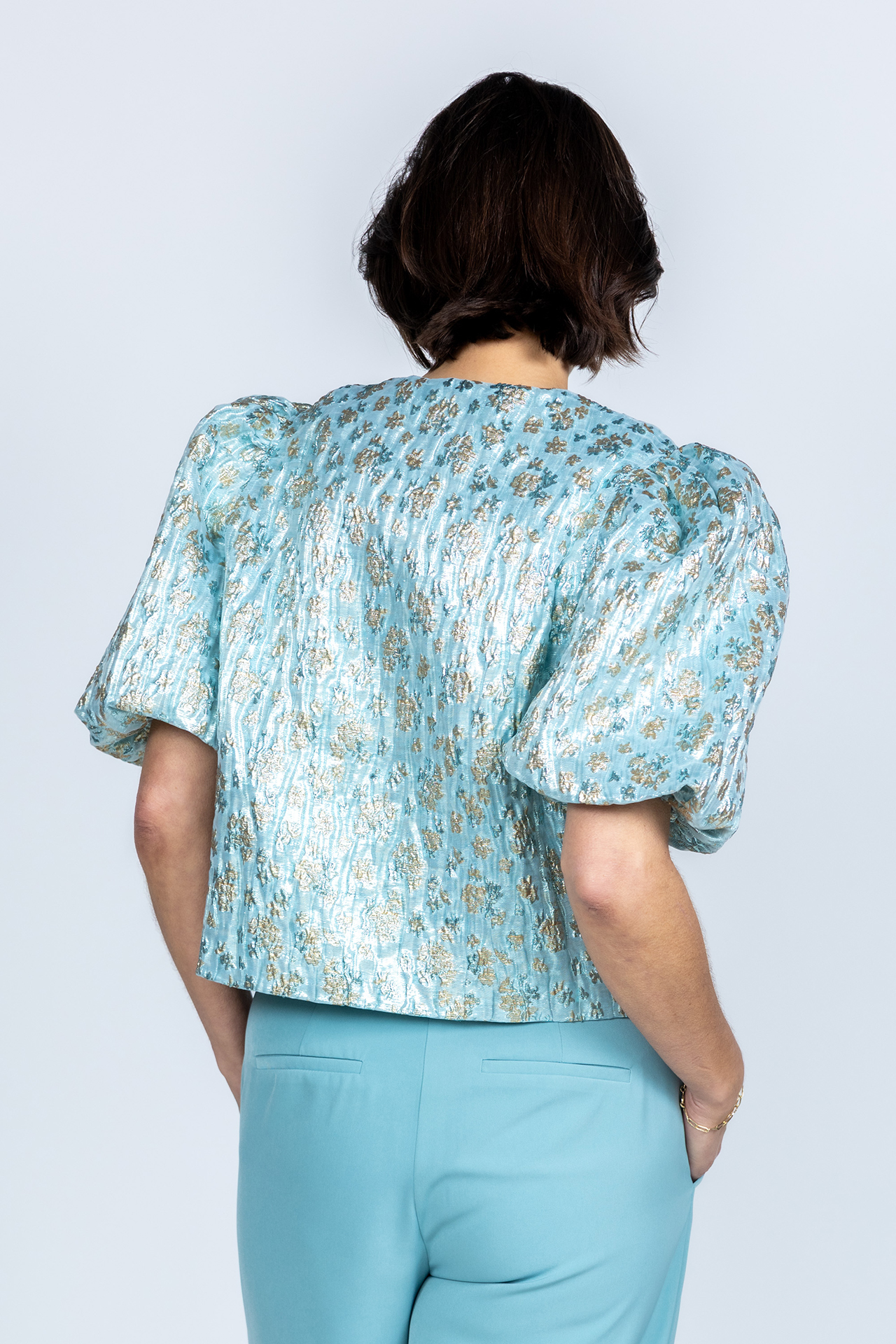 Glimmend jasje met een haaksluiting, ronde hals en pofmouwen