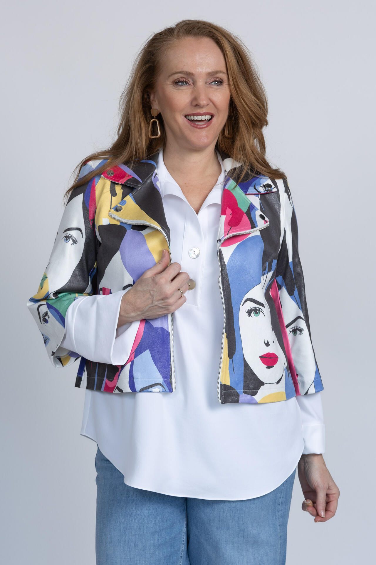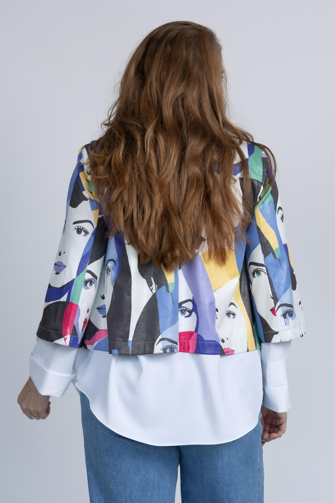 Kort jasje met driekwart mouwen, een kraag en een print met gekleurde gezichten