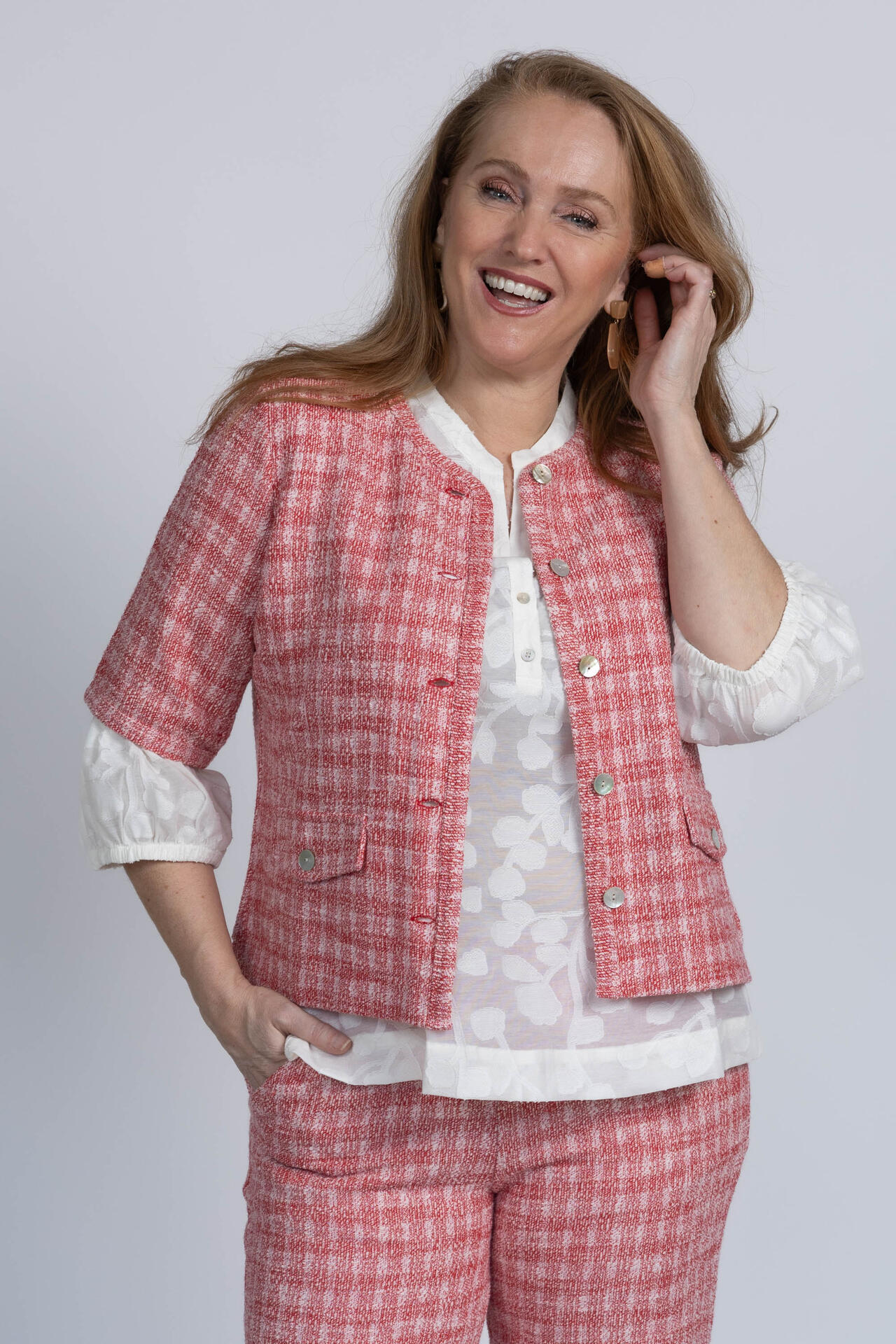 Bouclé jasje met een ronde hals, driekwart mouwen, knopen en klepzakken aan de voorkant