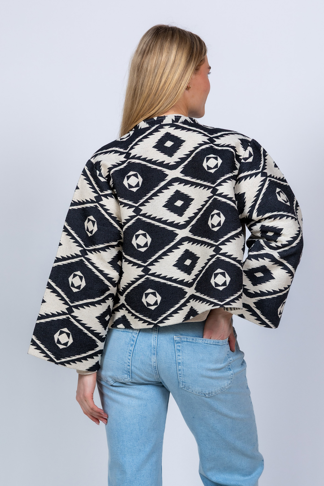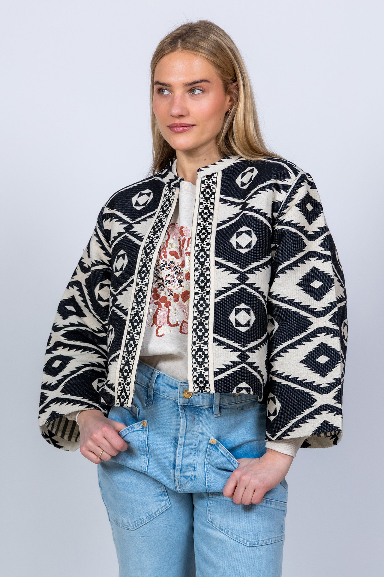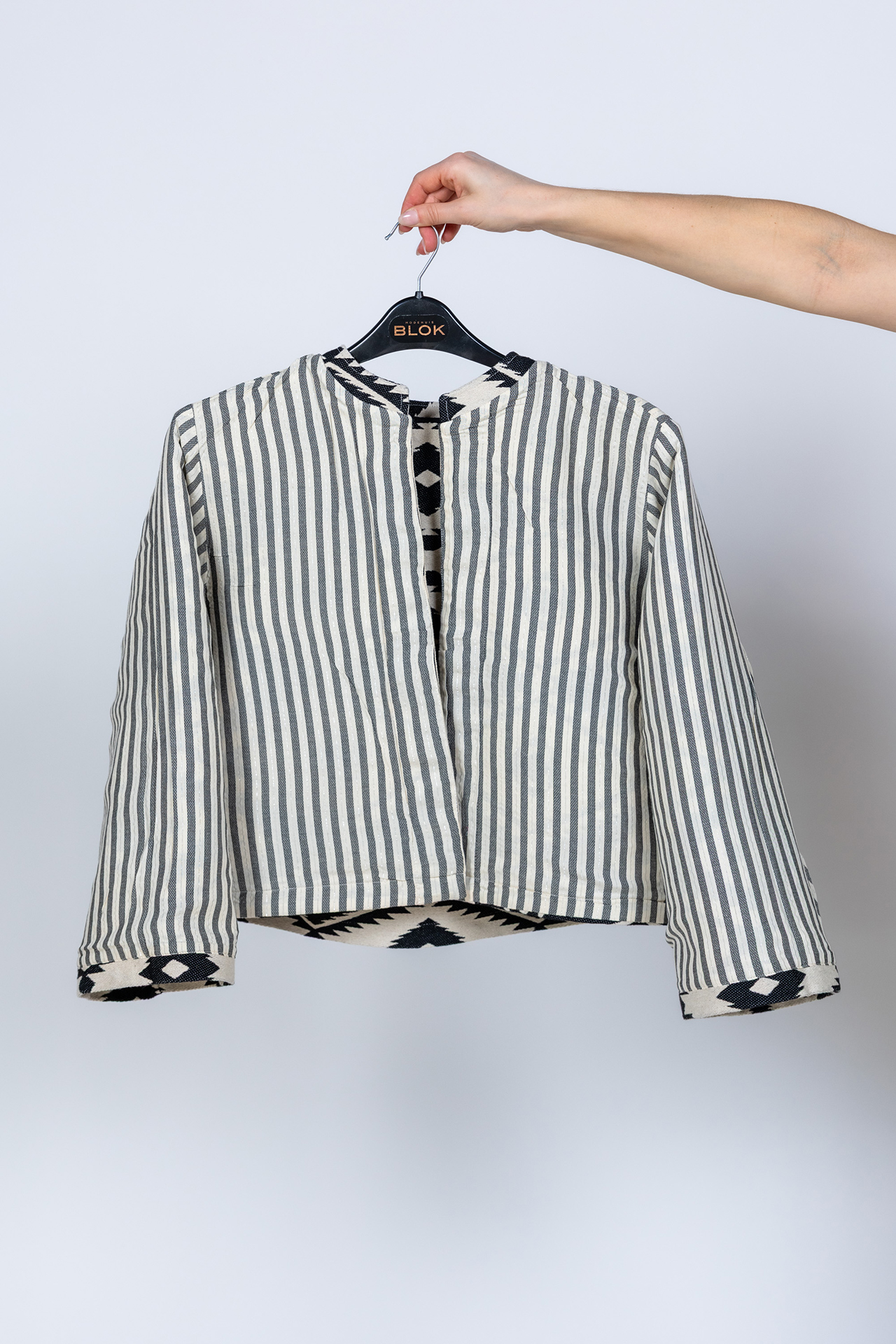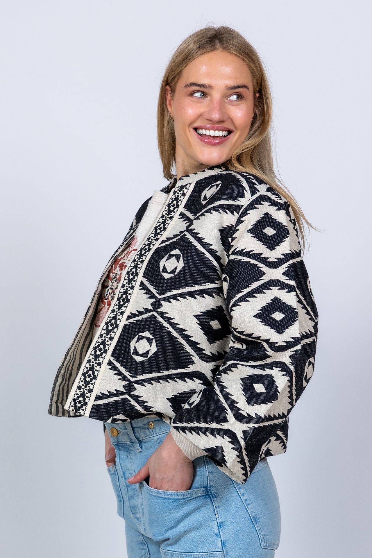 Reversible jasje met een ronde hals. Hij heeft aan de ene kant een aztec print en aan de andere een gestreept dessin