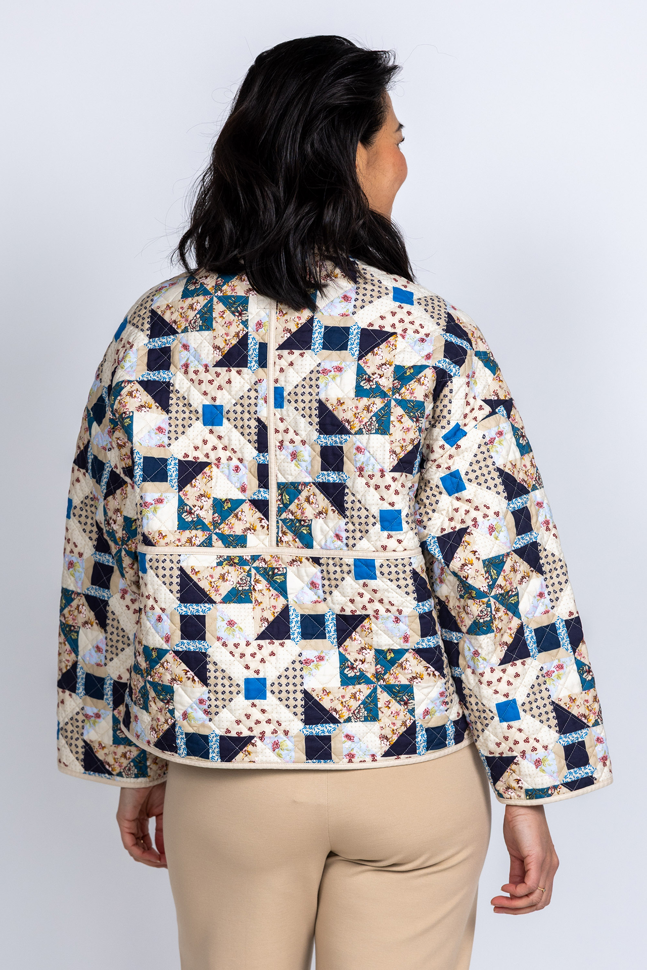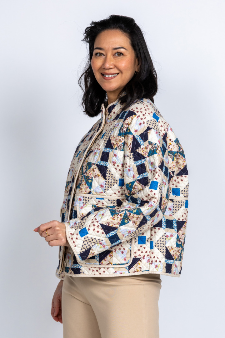 Patchwork doorgestikt jasje met klepzakken aan de voorkant