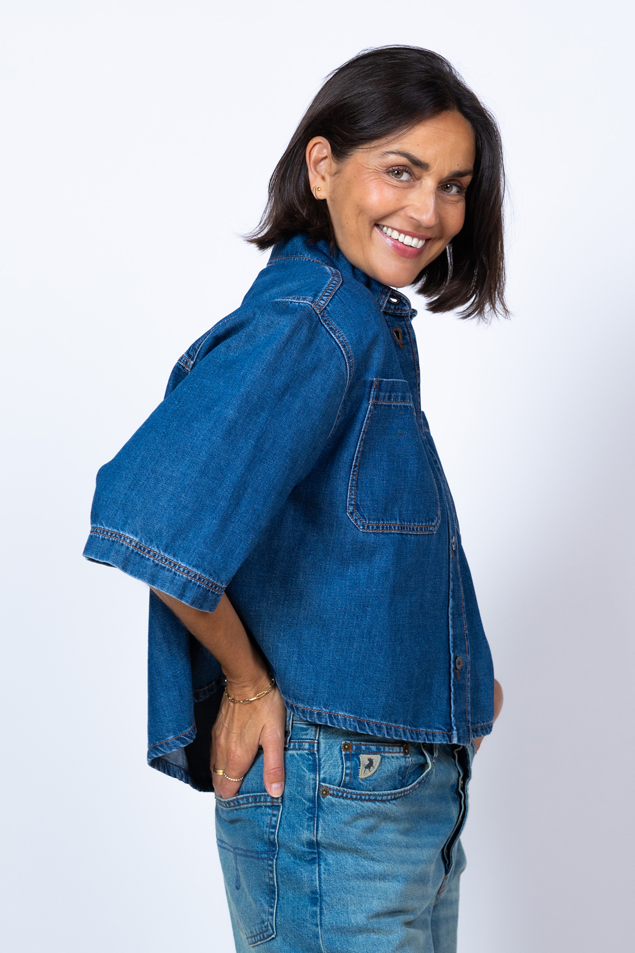 Boxy jeansjasje met korte mouwen en opgestikte borstzakken