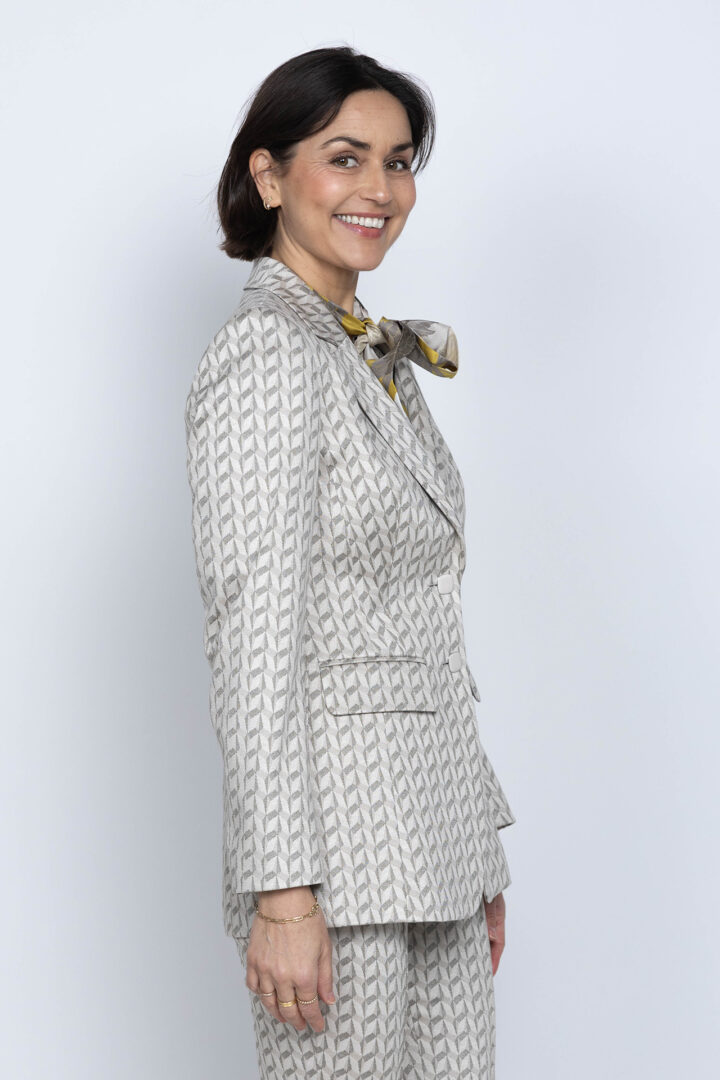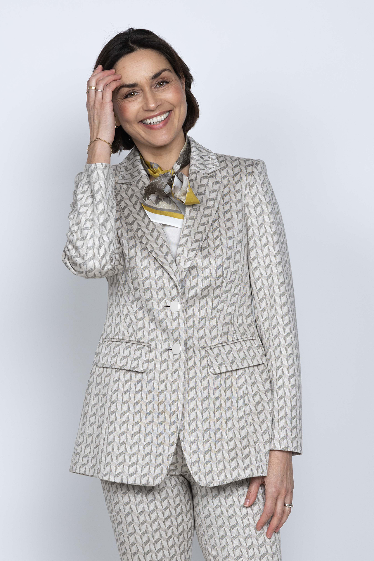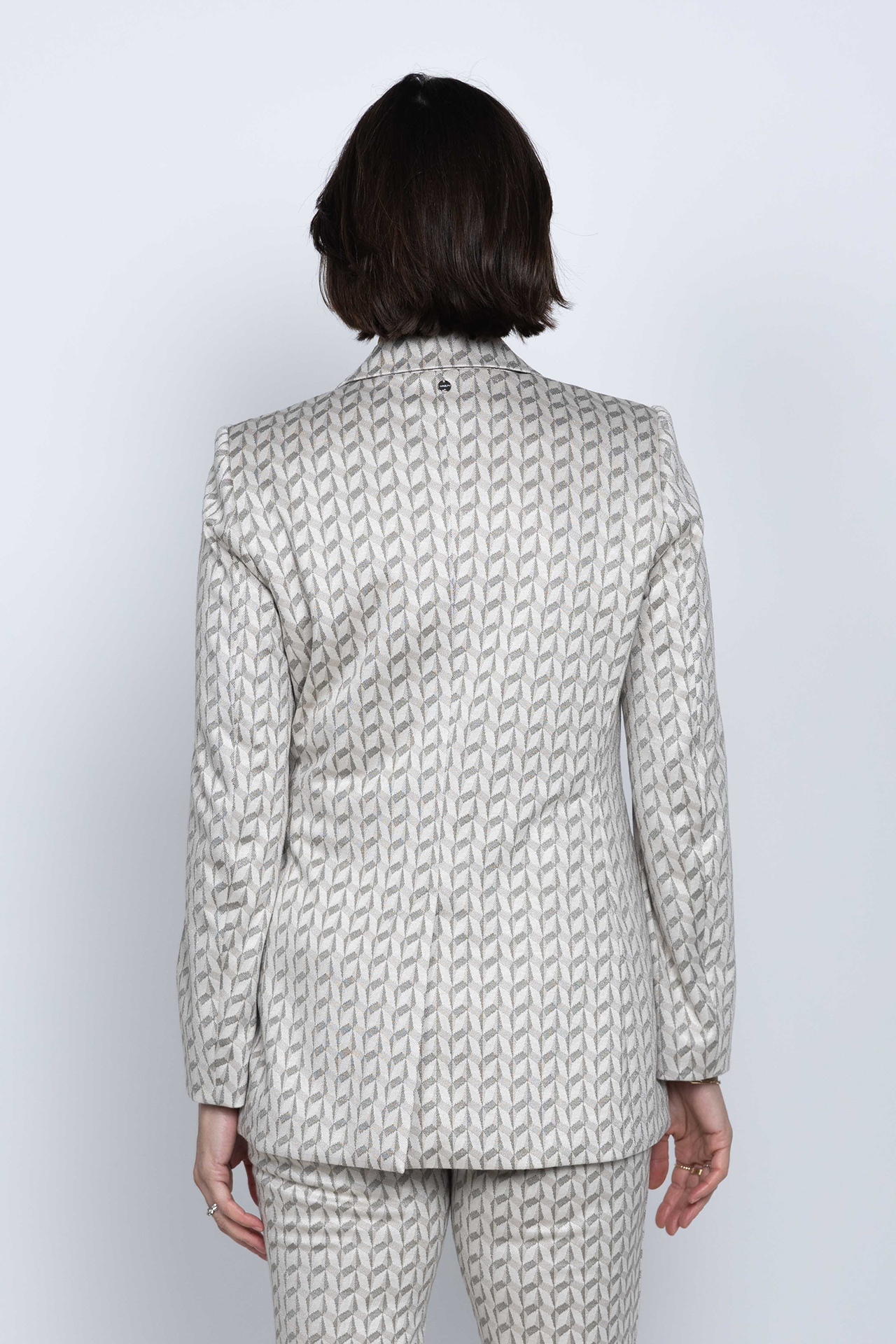 Getailleerde blazer met een reverskraag, knopen en klepzakken aan de voorkant. Hij heeft een split aan de achterkant en een all-over print met glitterdraad erdoor