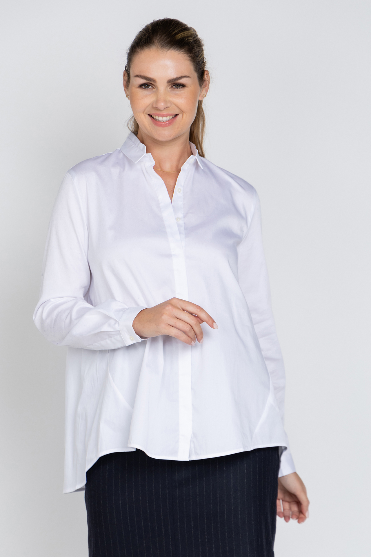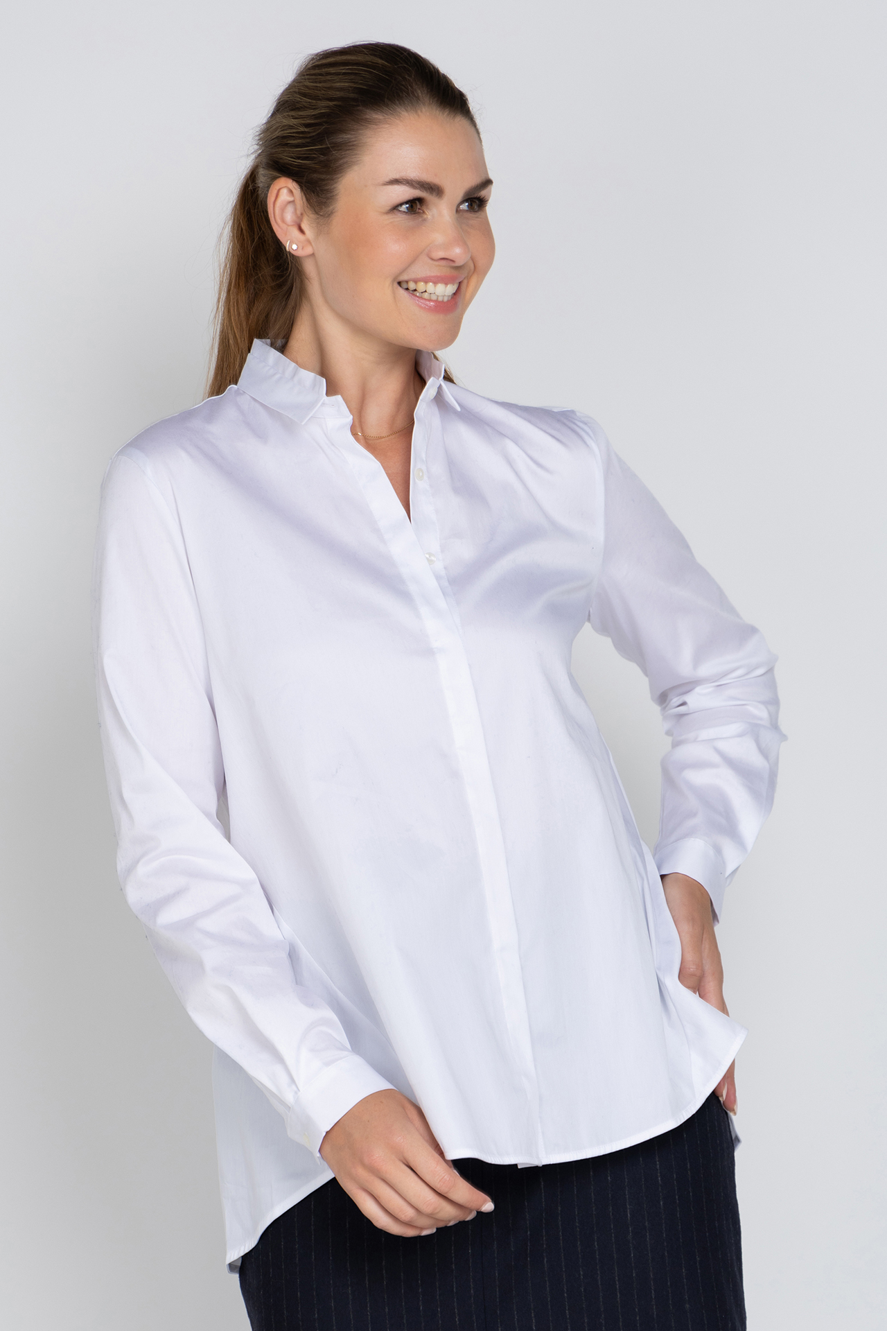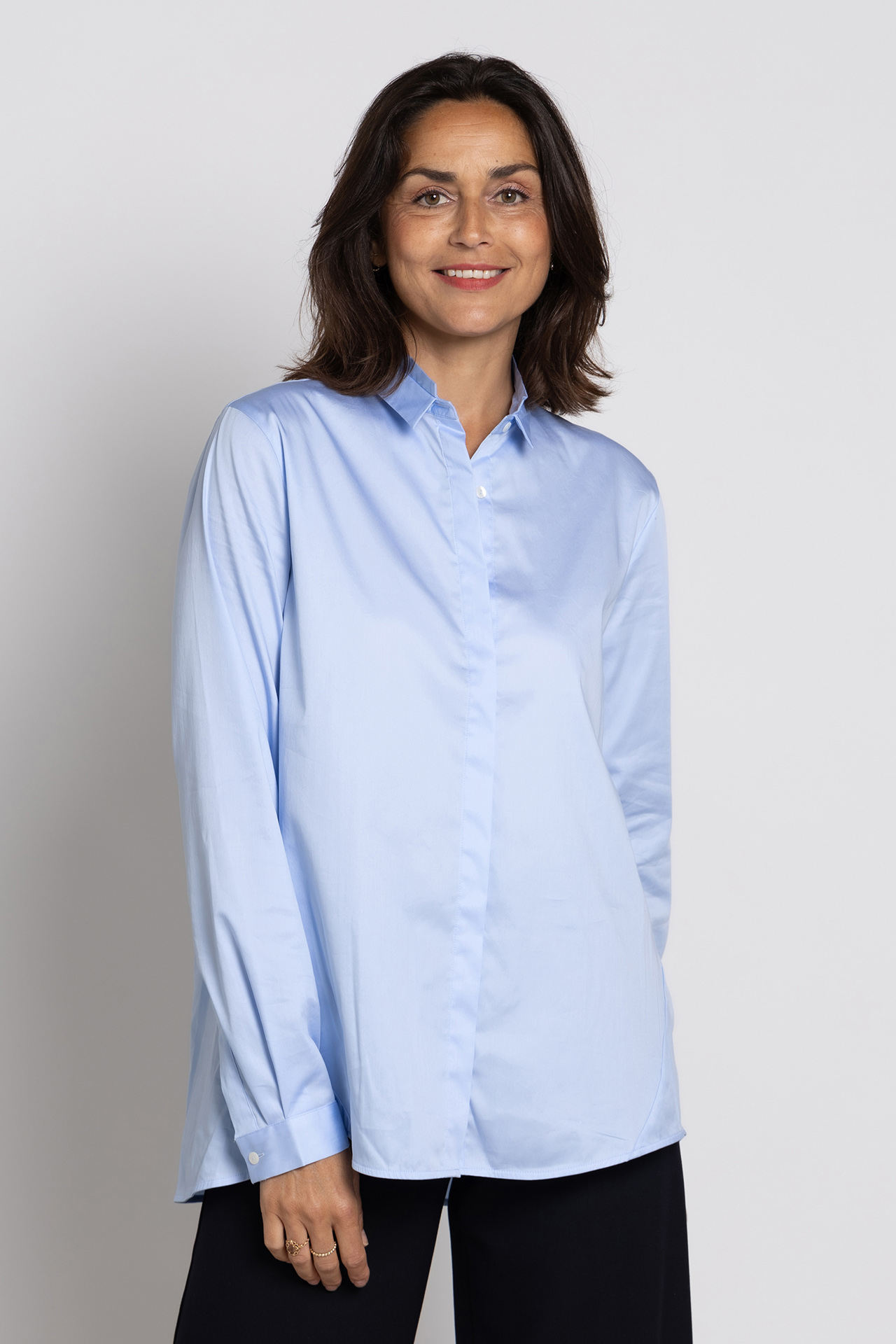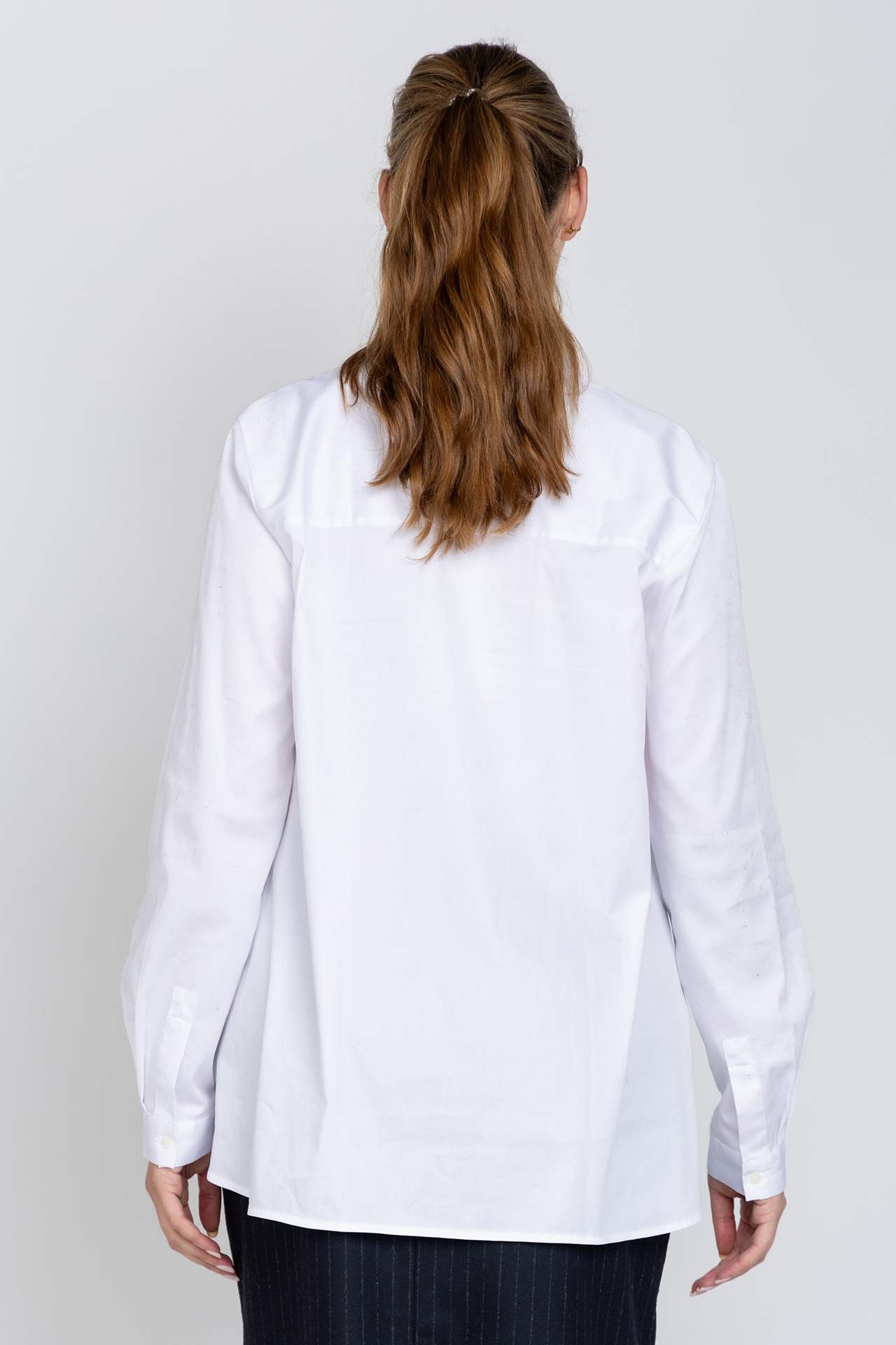 Blouse met lange mouwen, een opstaand kraagje met ruches en hij is iets langer aan de achterkant