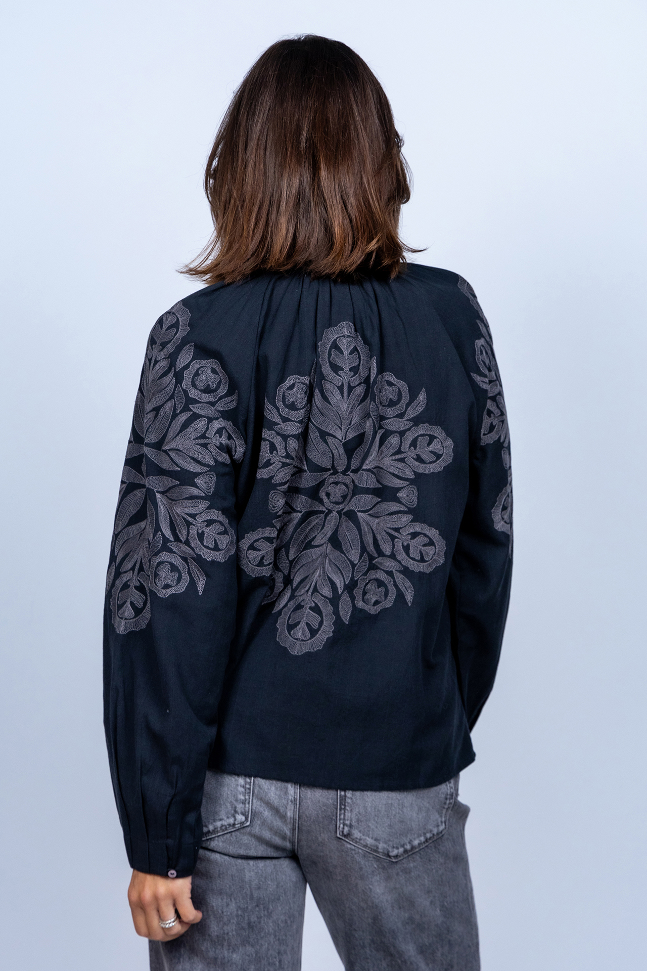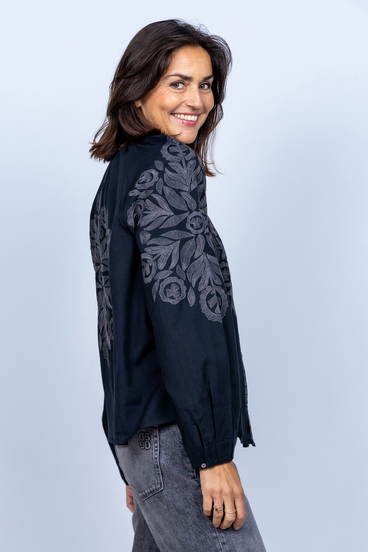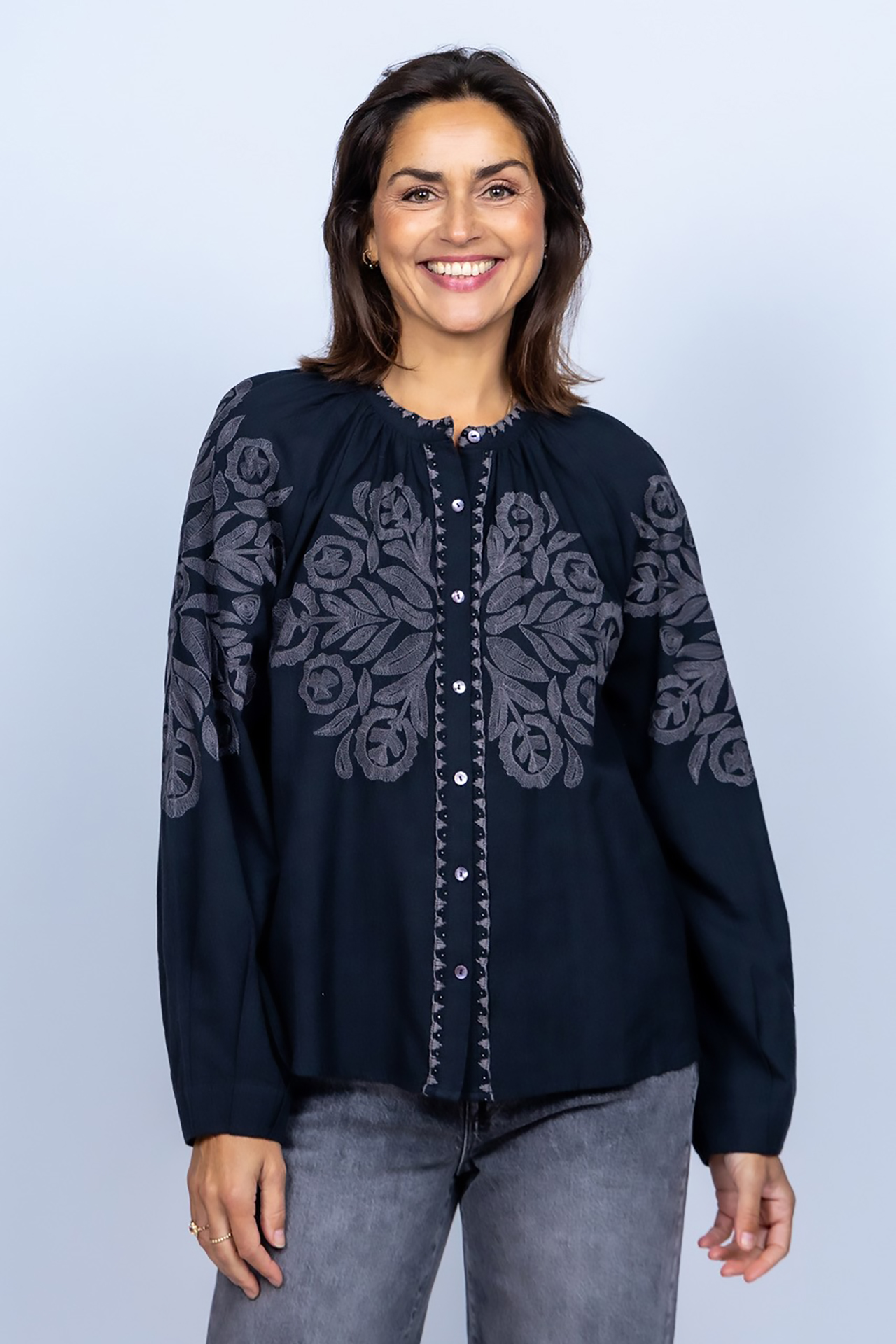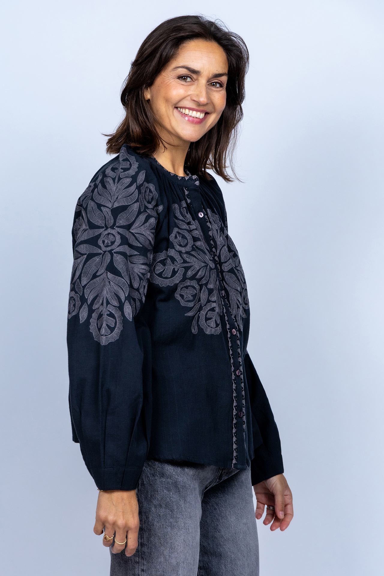 Katoenen loose fit blouse met ballonmouwen, een ronde hals en borduursels