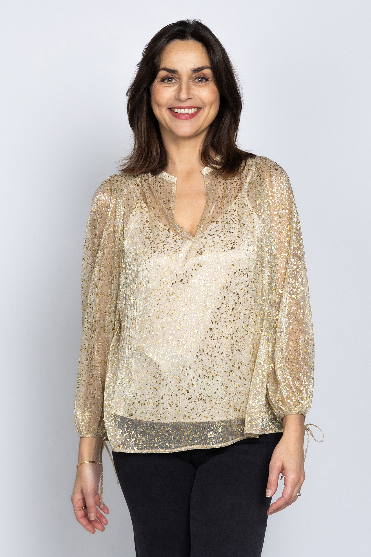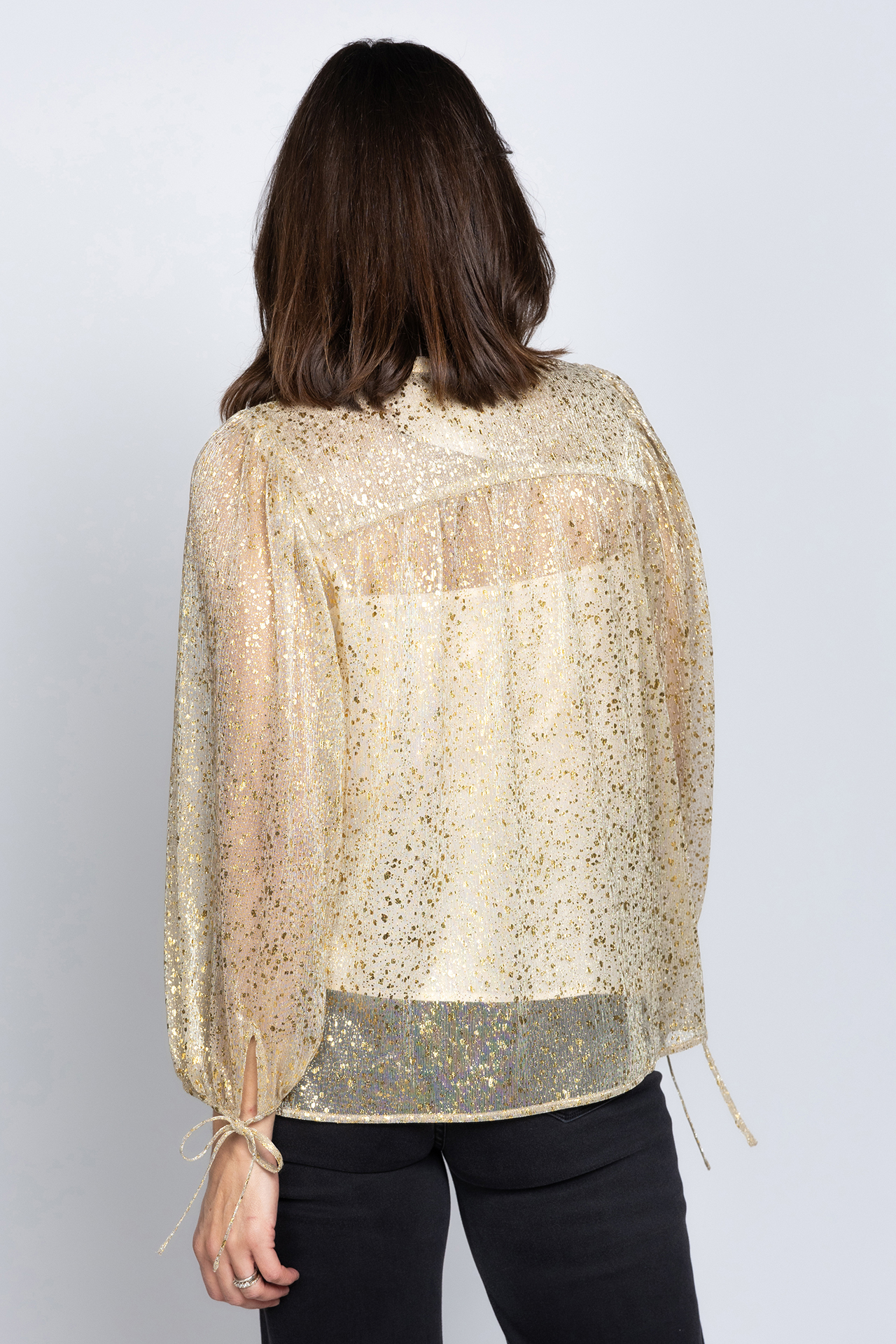 Semi-transparante blouse met een gouden print en ballonmouwen met strikkoordje aan de manchetten