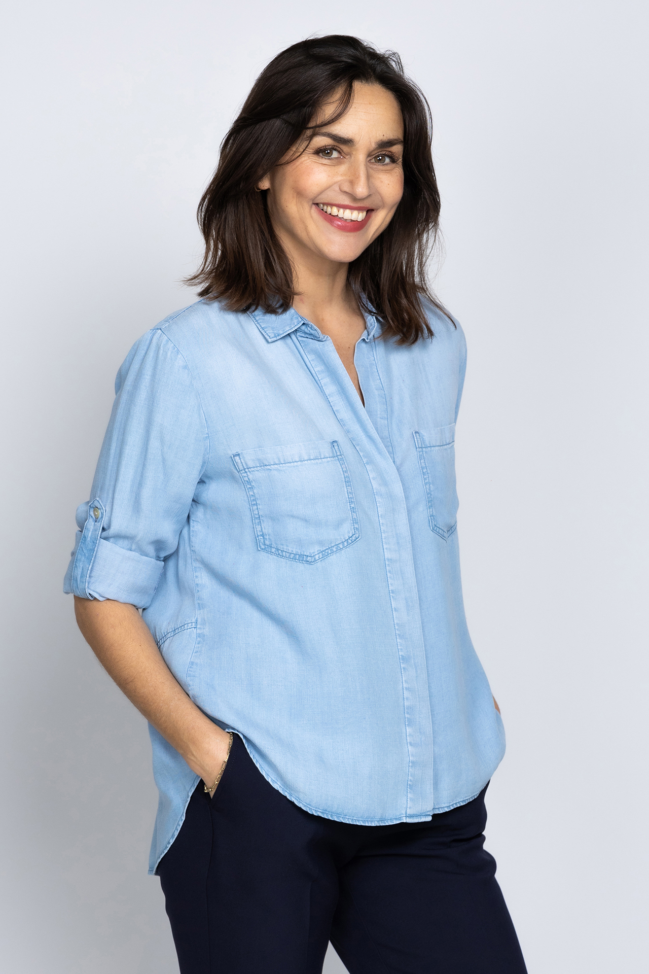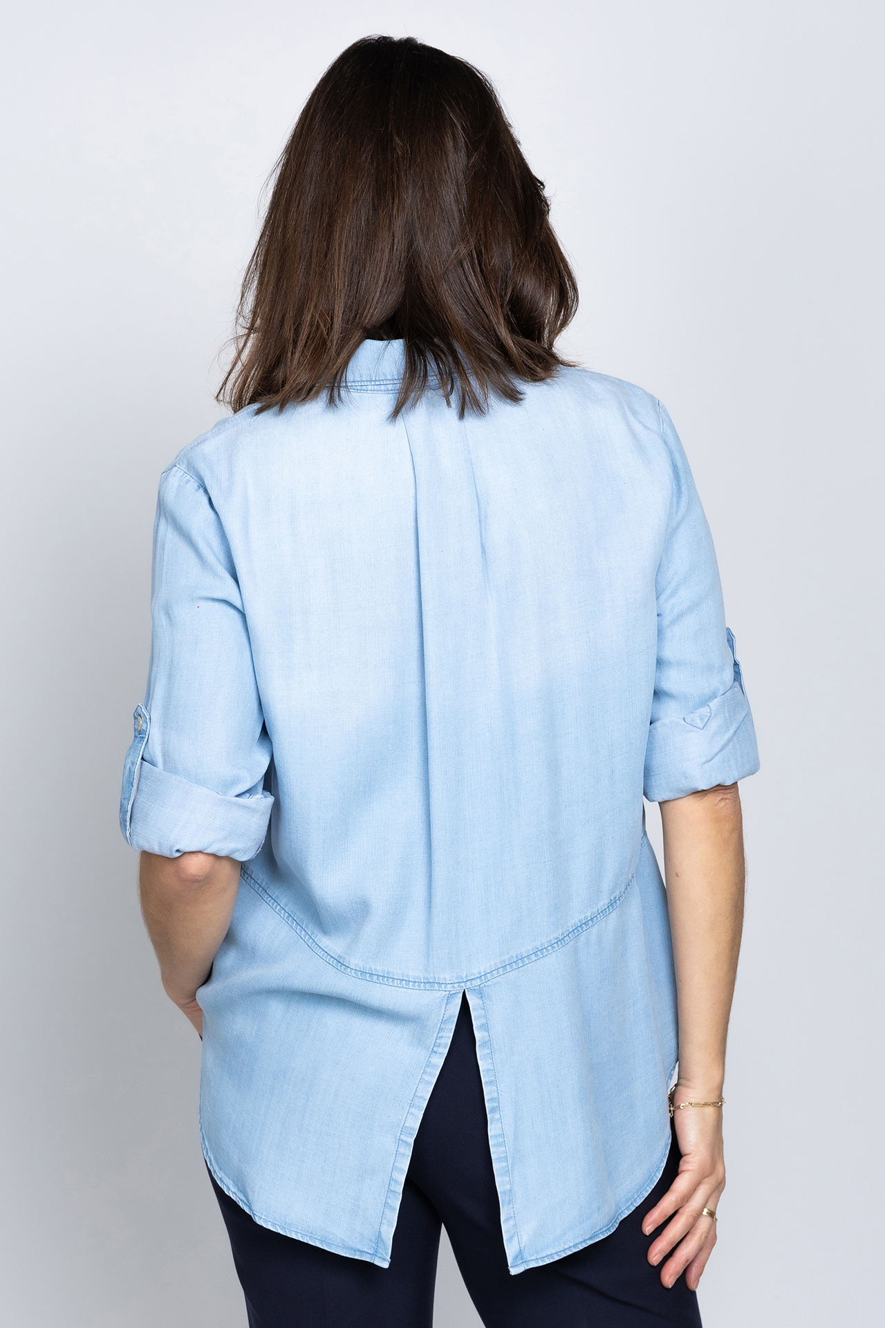 Super zachte kwaliteit blouse met lange mouwen die je sportief kan oprollen. Hij heeft 2 borstzakjes, een kraag, verborgen knoopsluiting en een split aan de achterkant