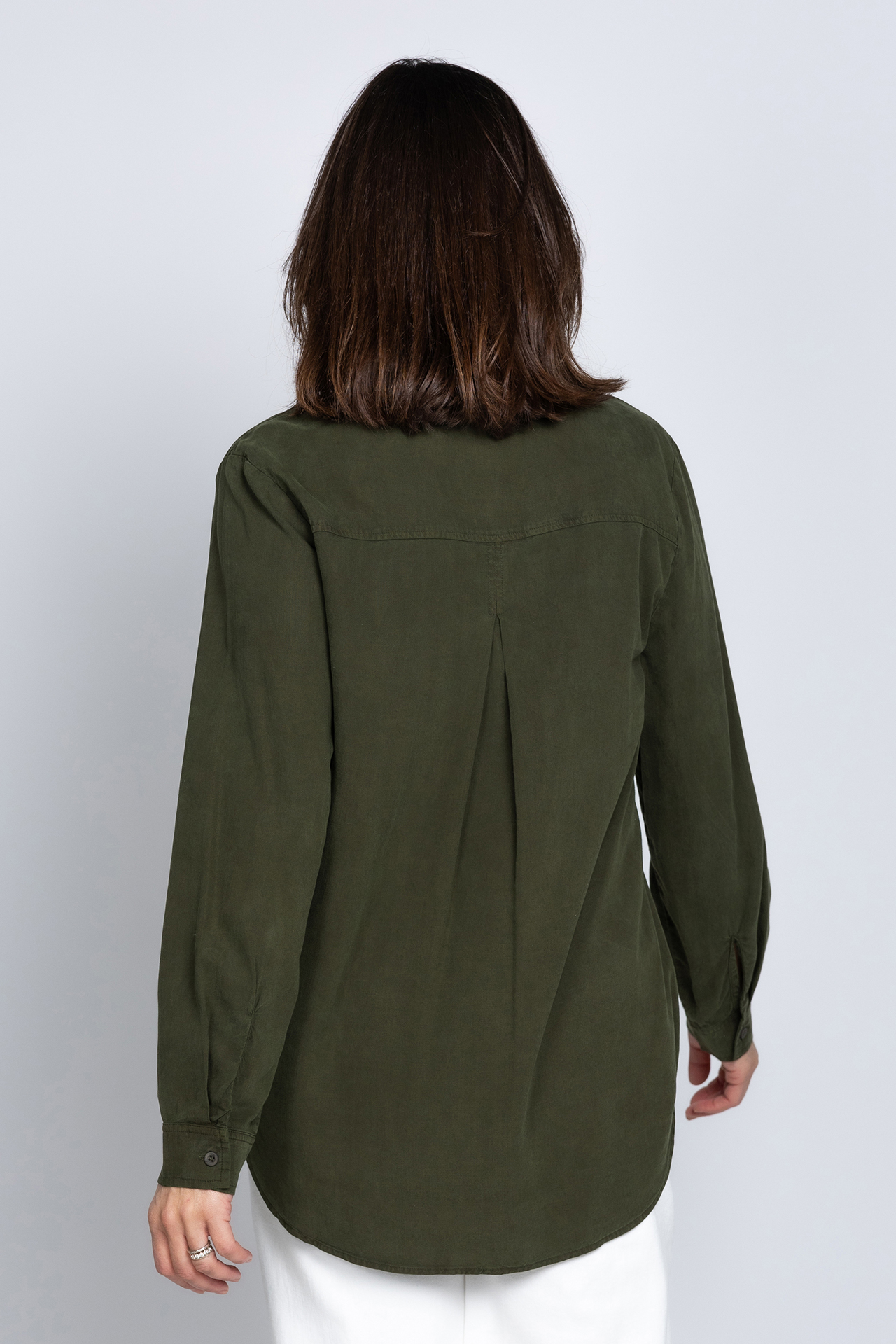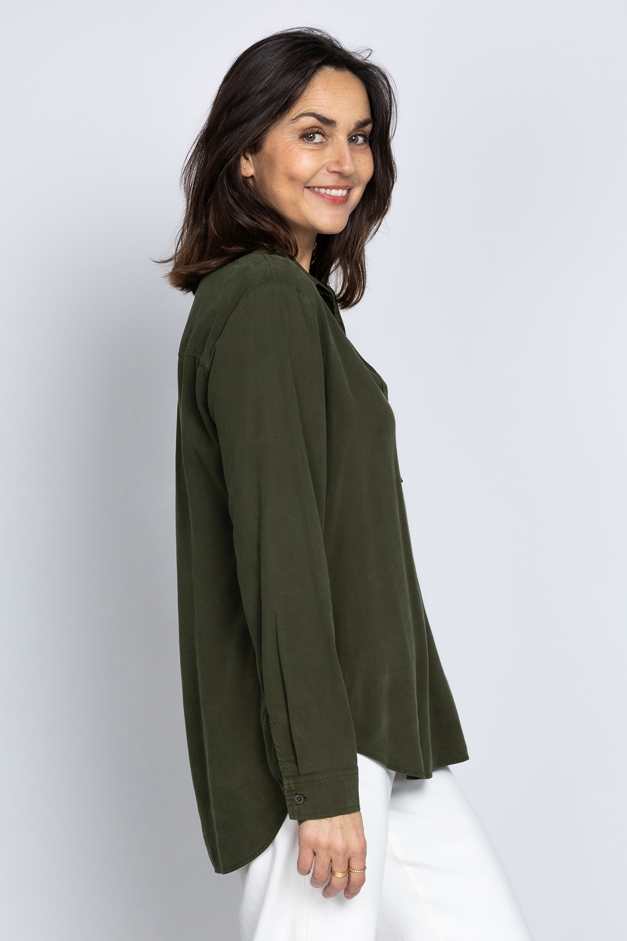 Super zachte blouse met lange mouwen en een kraag met V-hals. Hij heeft een plooi op de rug, een borstzak aan de voorkant en de achterkant is langer