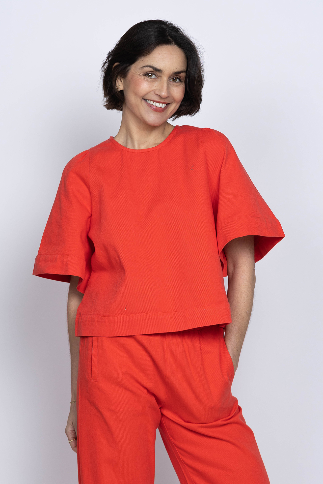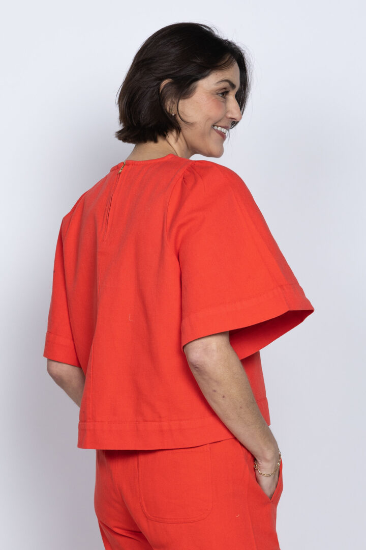 Katoenen blouse met korte wijde mouwen, een ronde hals en een rits aan de achterkant