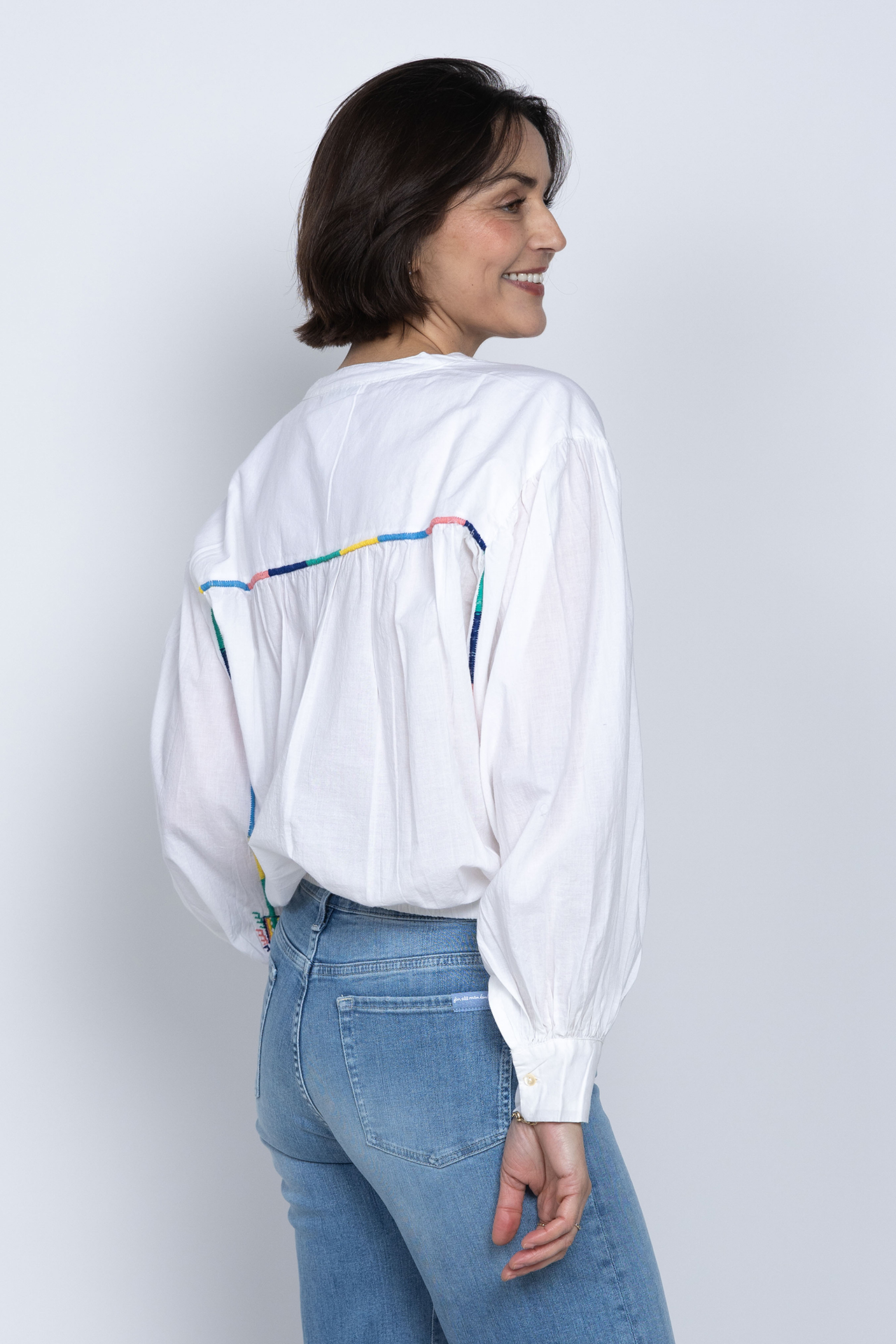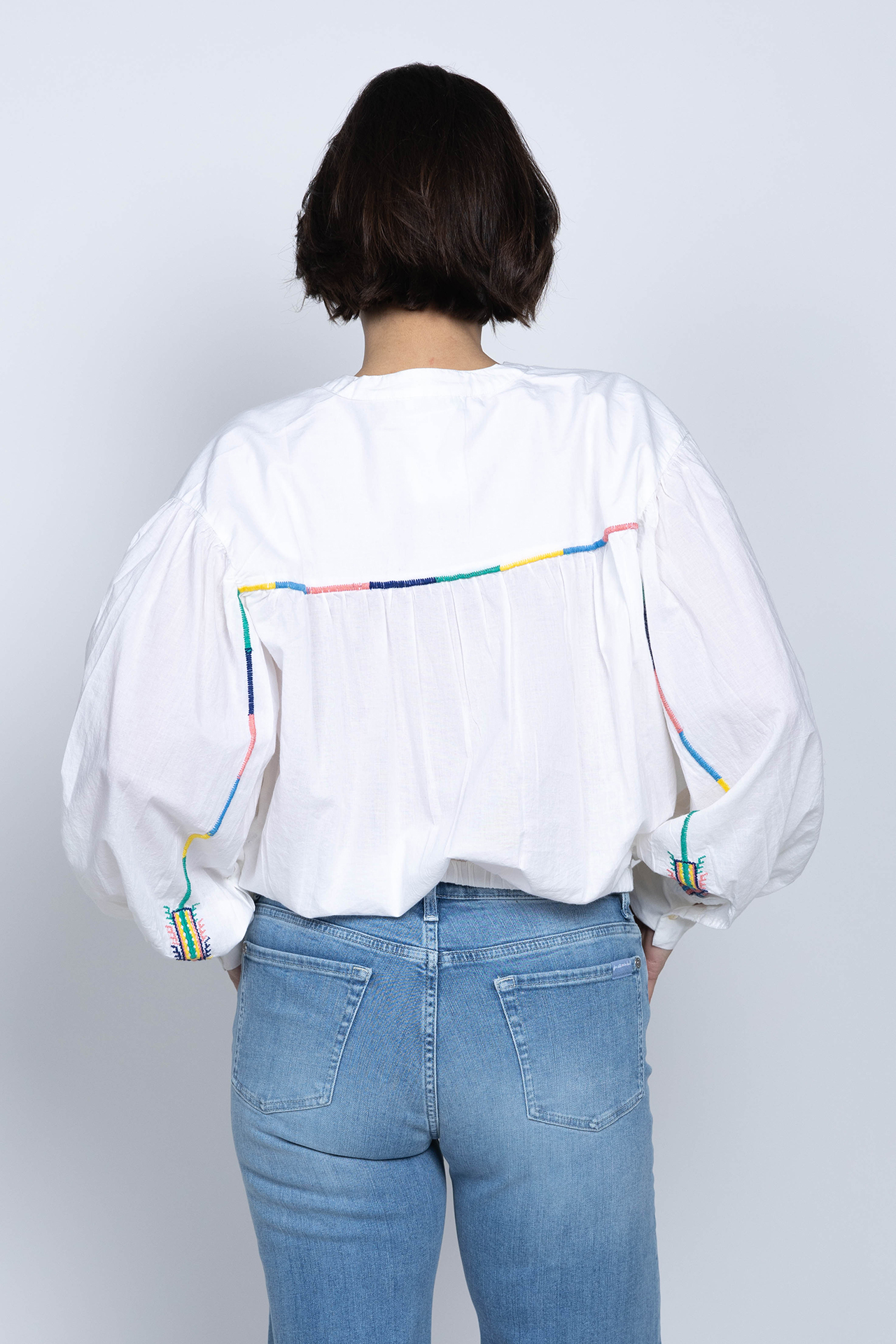Katoenen blouse met een V-hals, ballonmouwen en gekleurde borduursels aan de achterkant