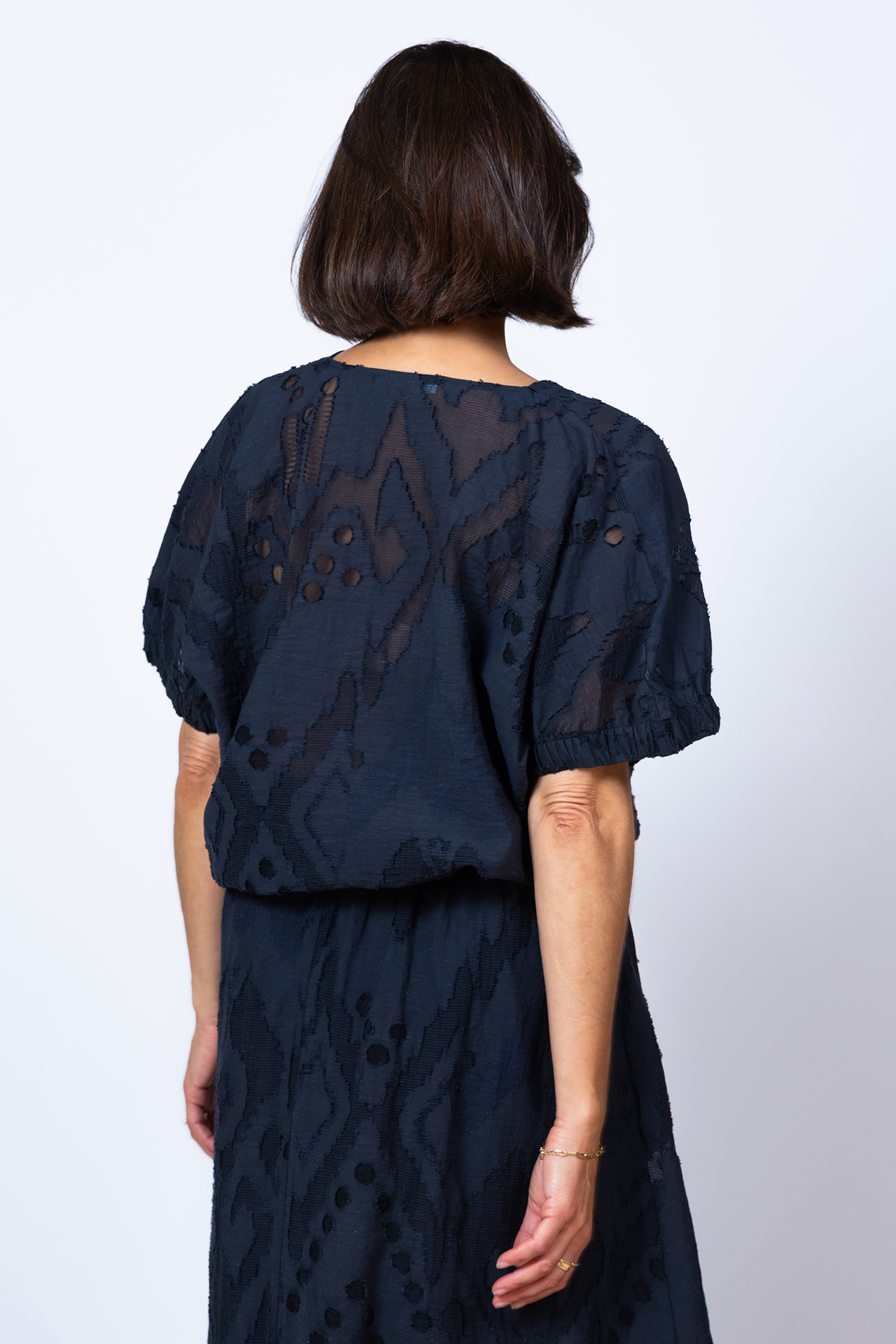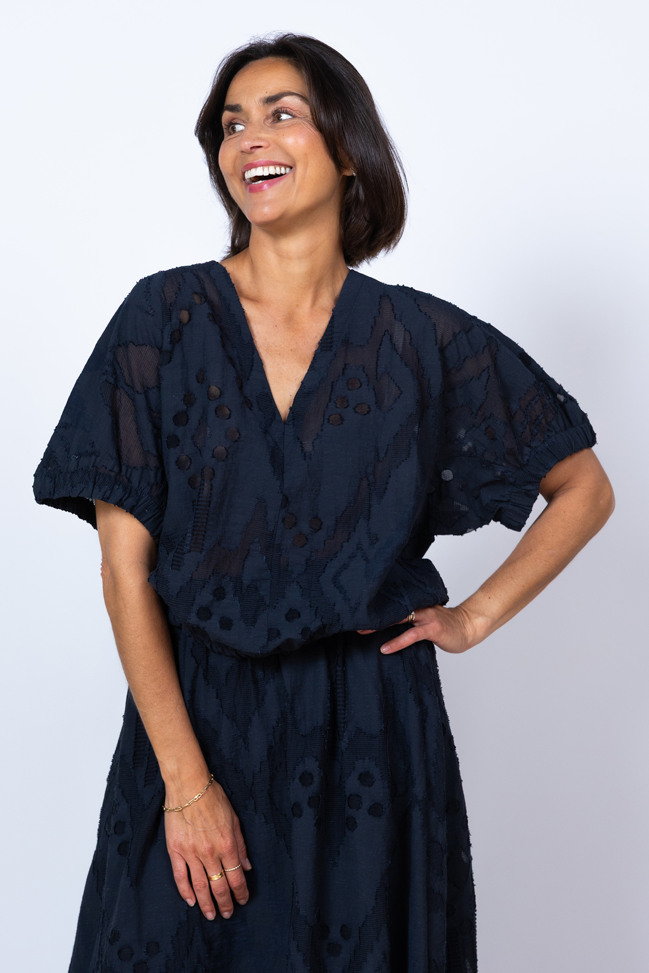 Blouse gemaakt van organisch katoen met aangeknipte mouwen en een V-hals. Hij heeft elastiek aan de mouwen en onderkant en een patroon in de stof met transparante details