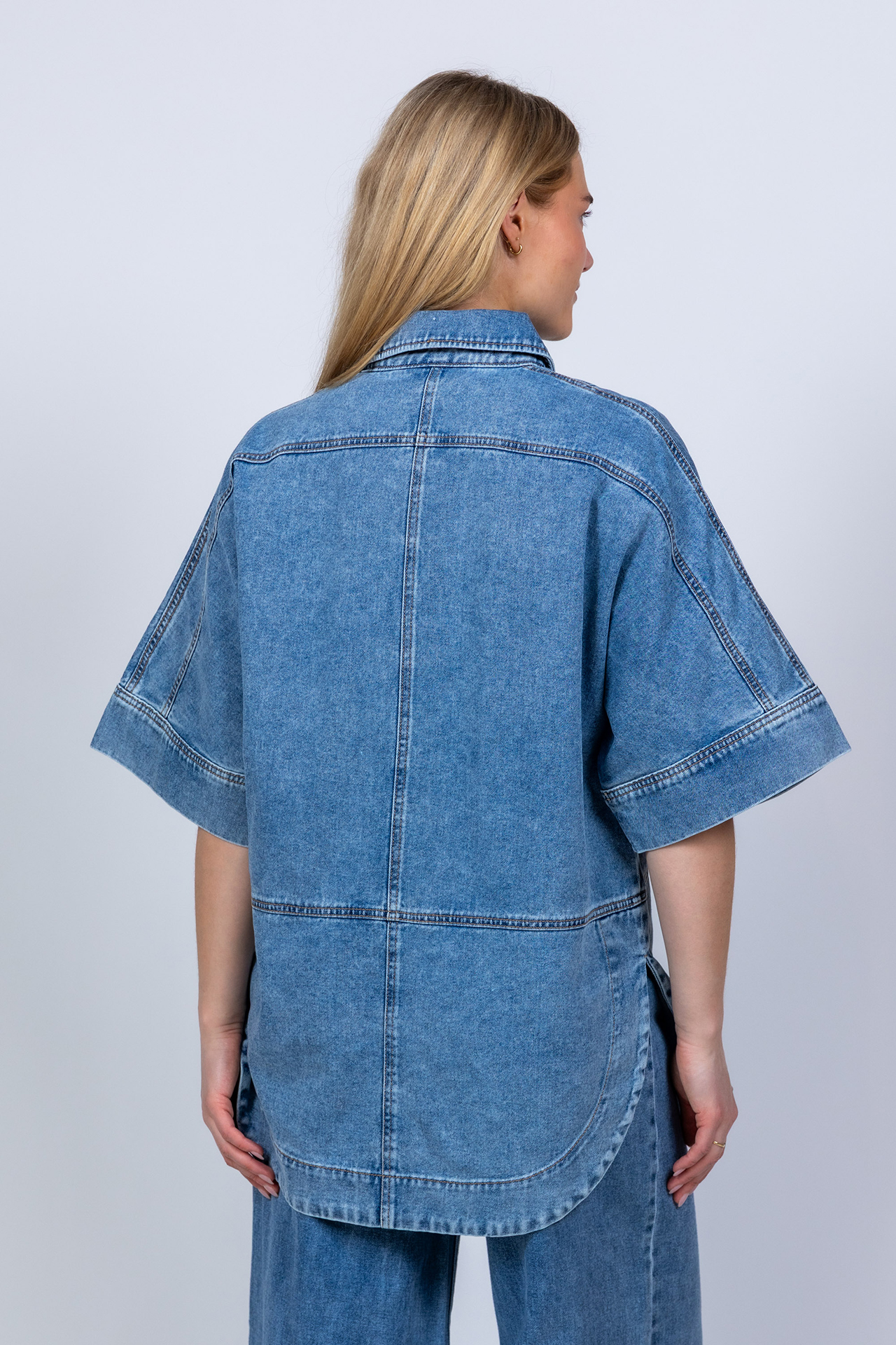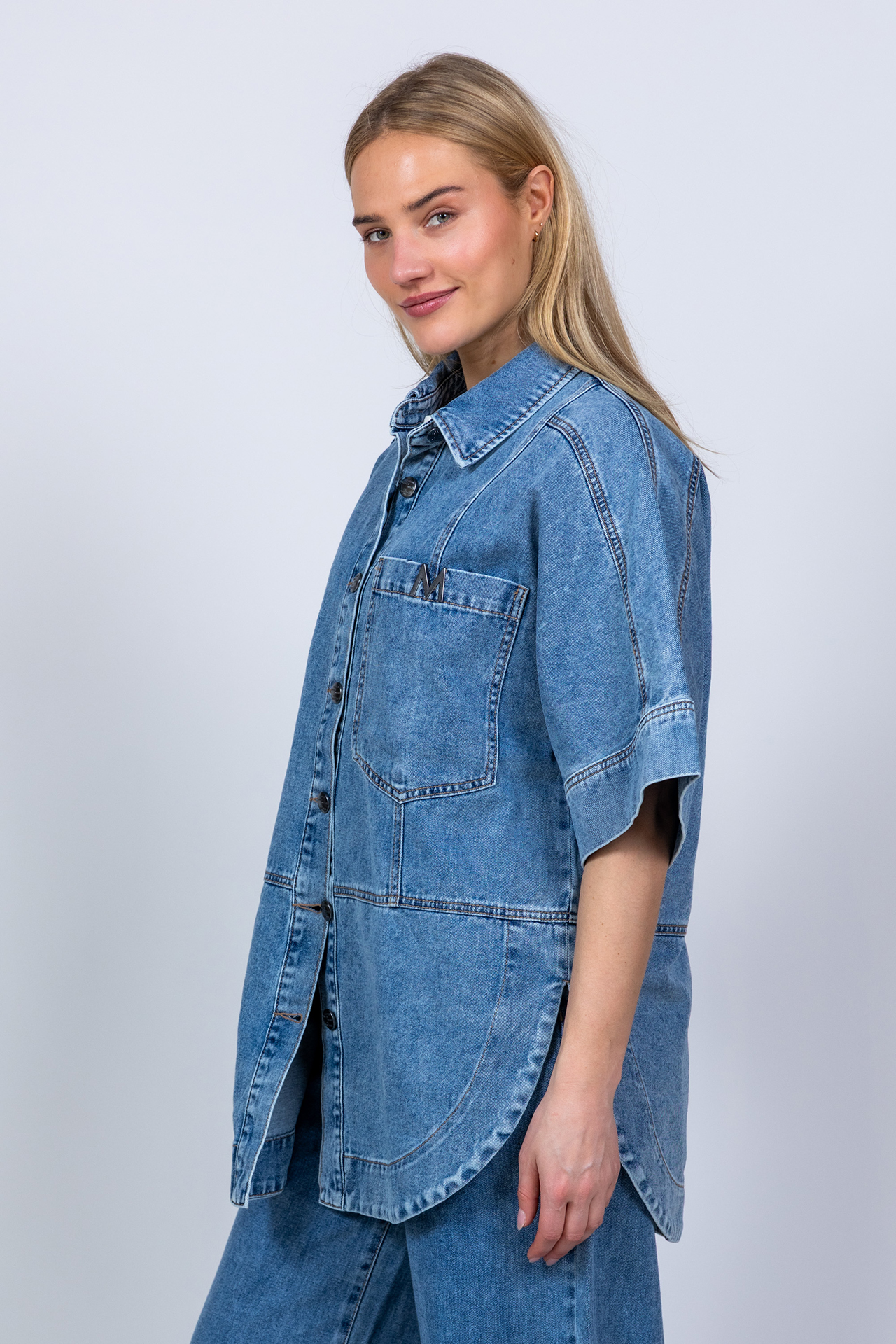 Jeans blouse/jasje met korte mouwen, sportieve naden en een borstzak met de letter M