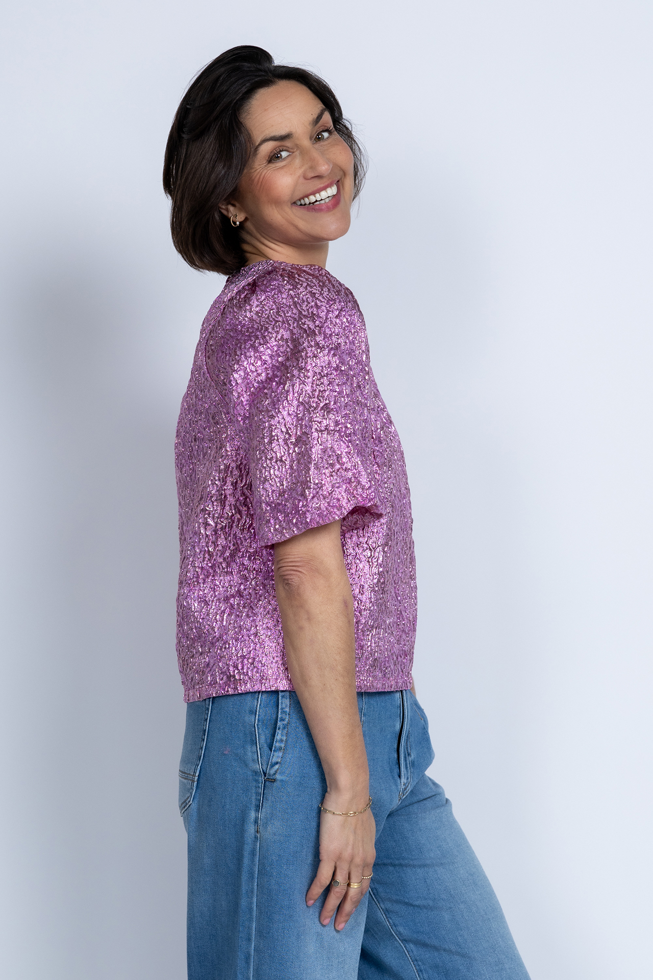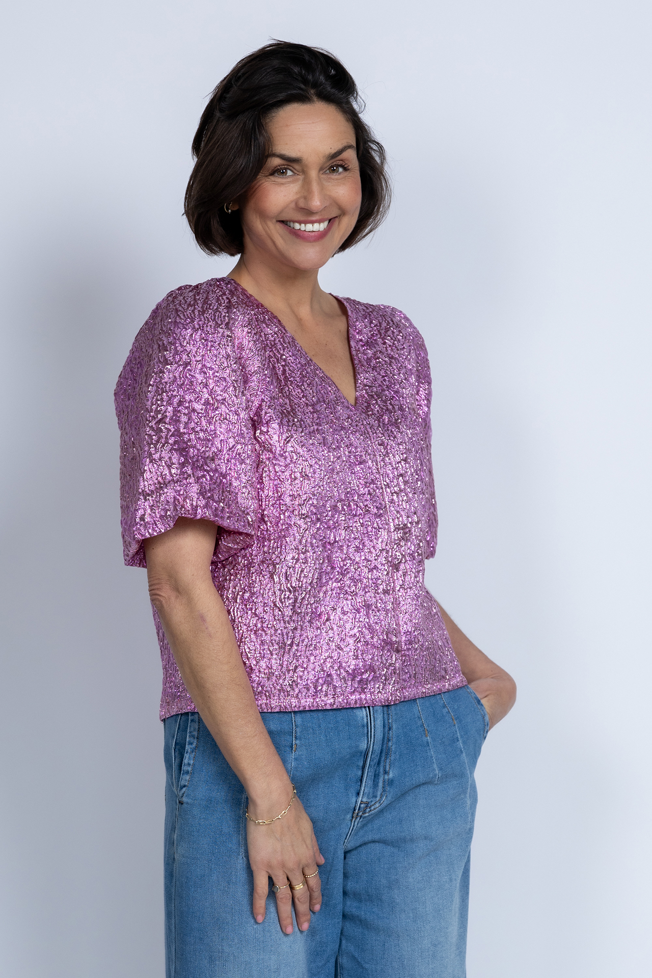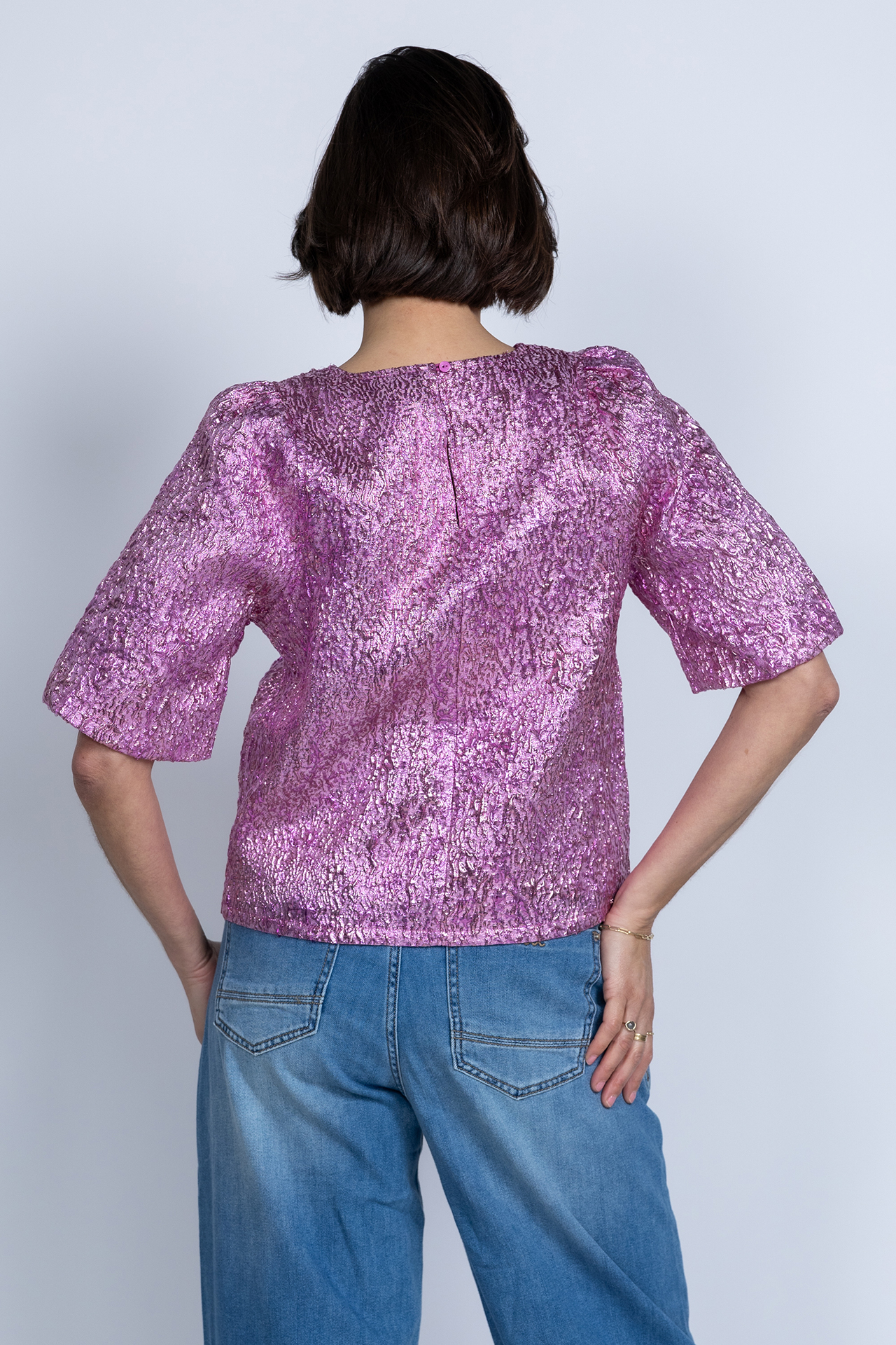 Glitterblouse met pofmouwen, een V-hals en een knoopje aan de achterkant van de hals