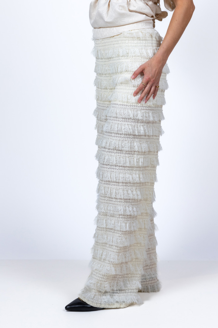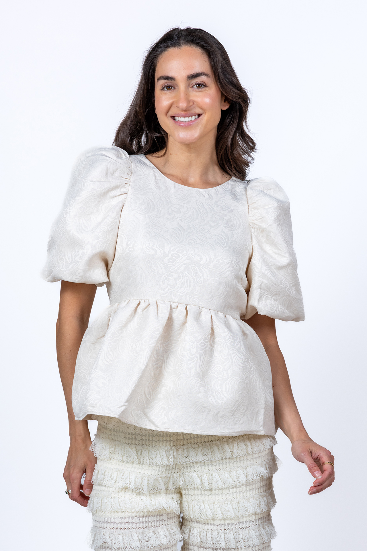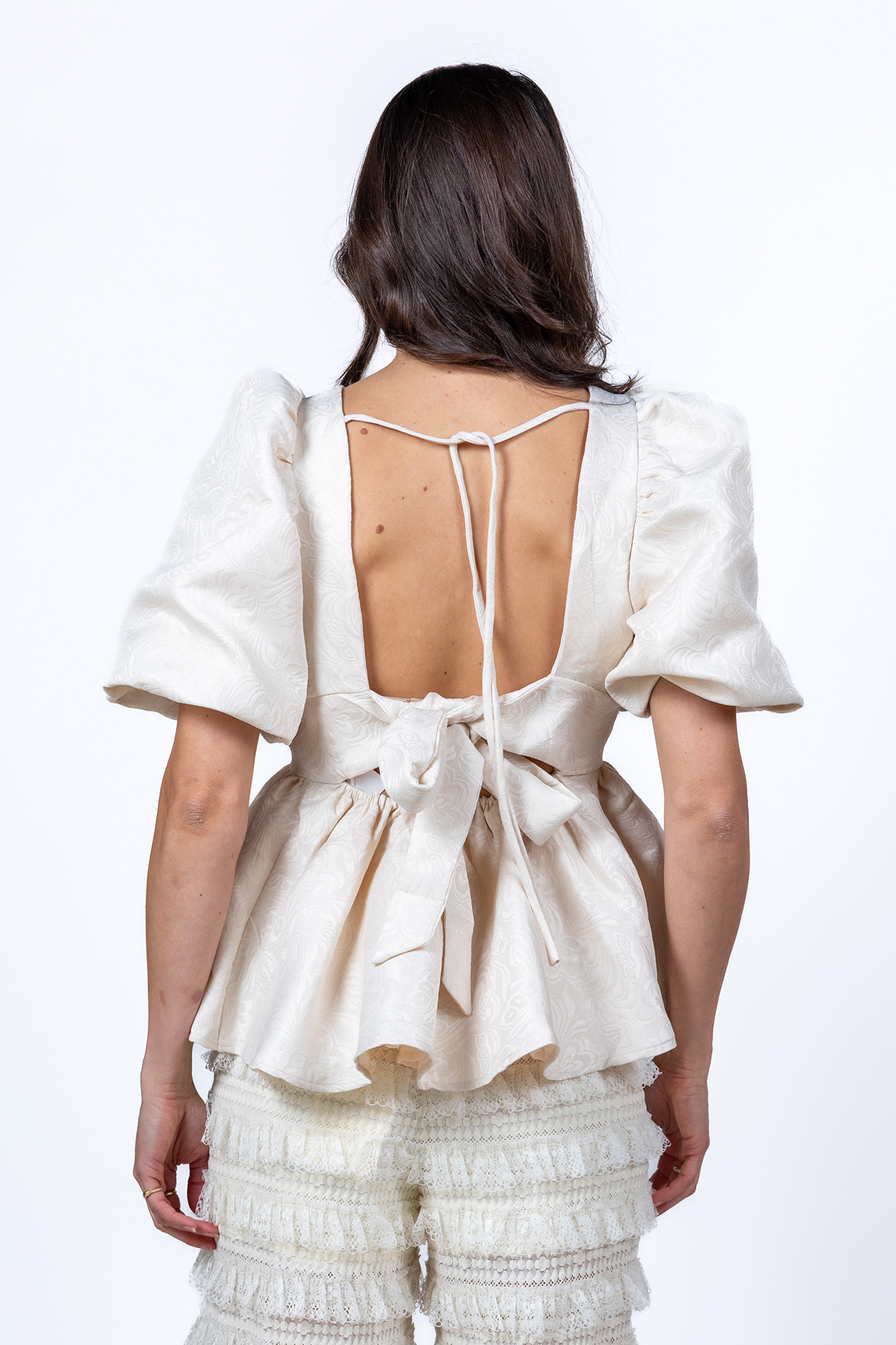 Blouse met pofmouwen, plooitjes in de taille en een all-over ton sur ton bloemenprint. Hij heeft een open rug en strik aan de achterkant