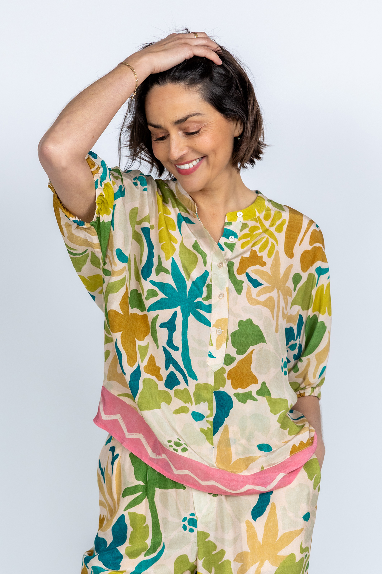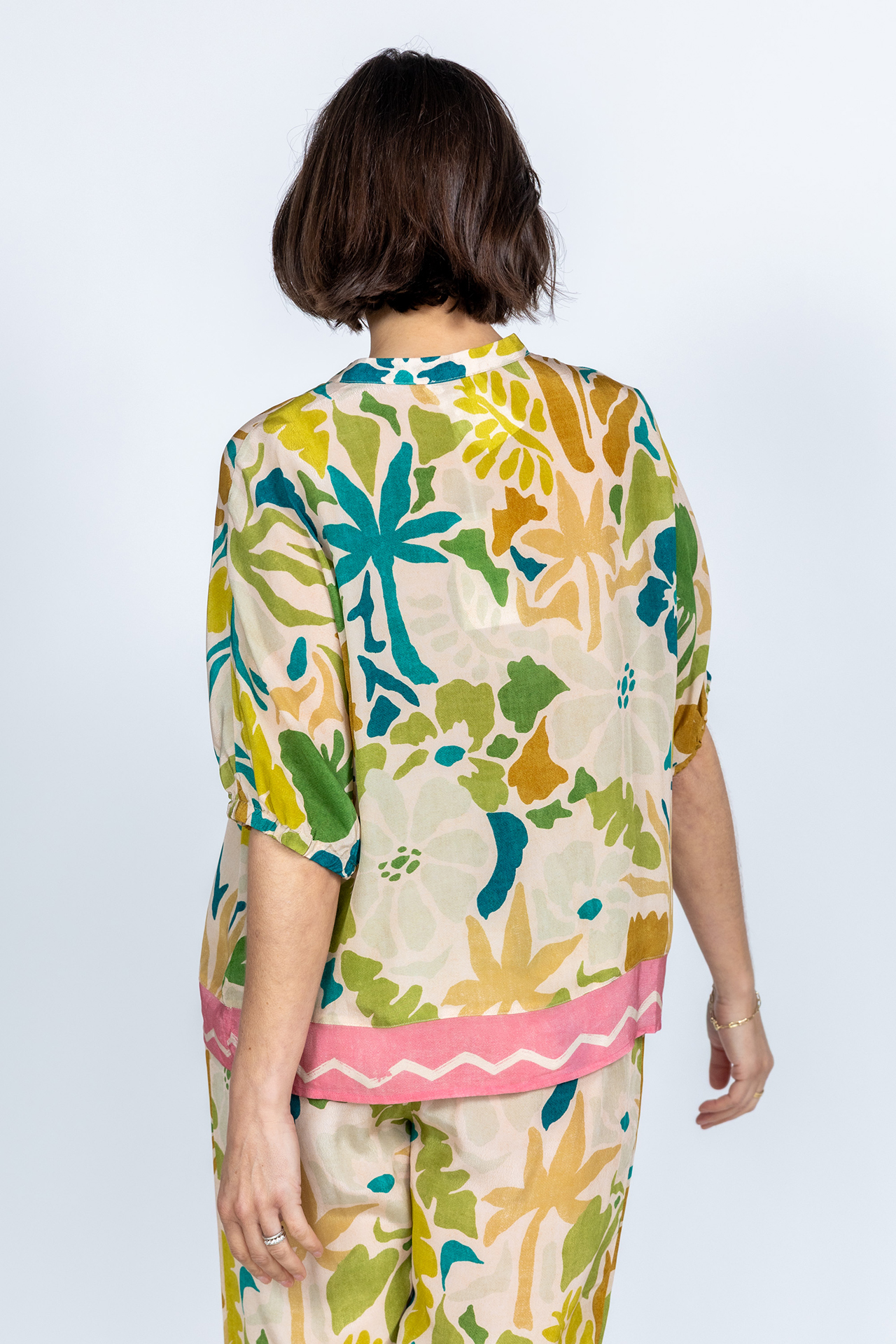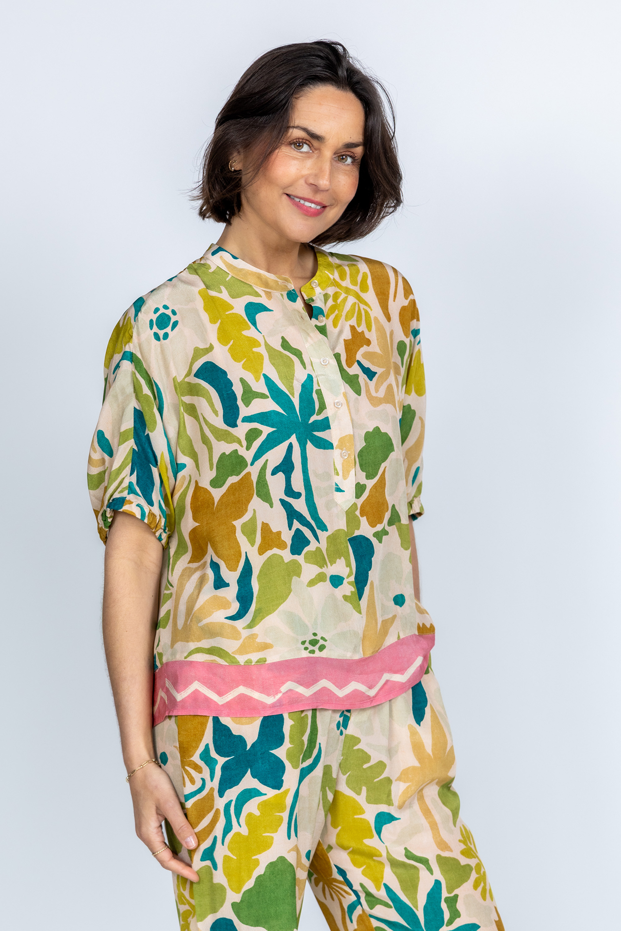 Viscose blouse met korte mouwen, een zomerse print en een ronde hals